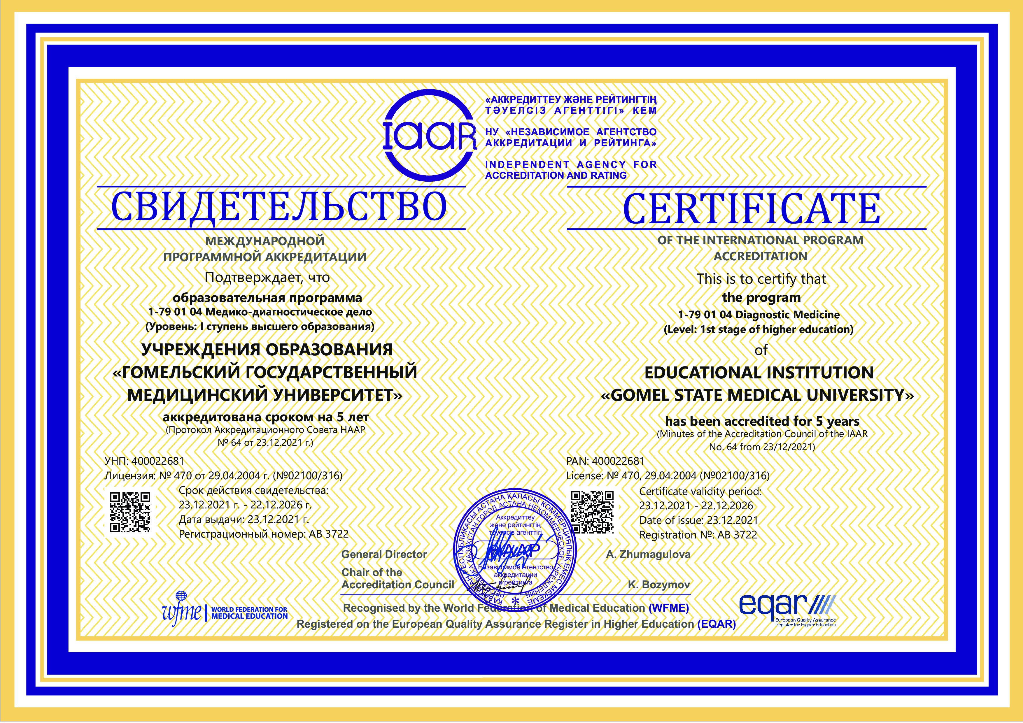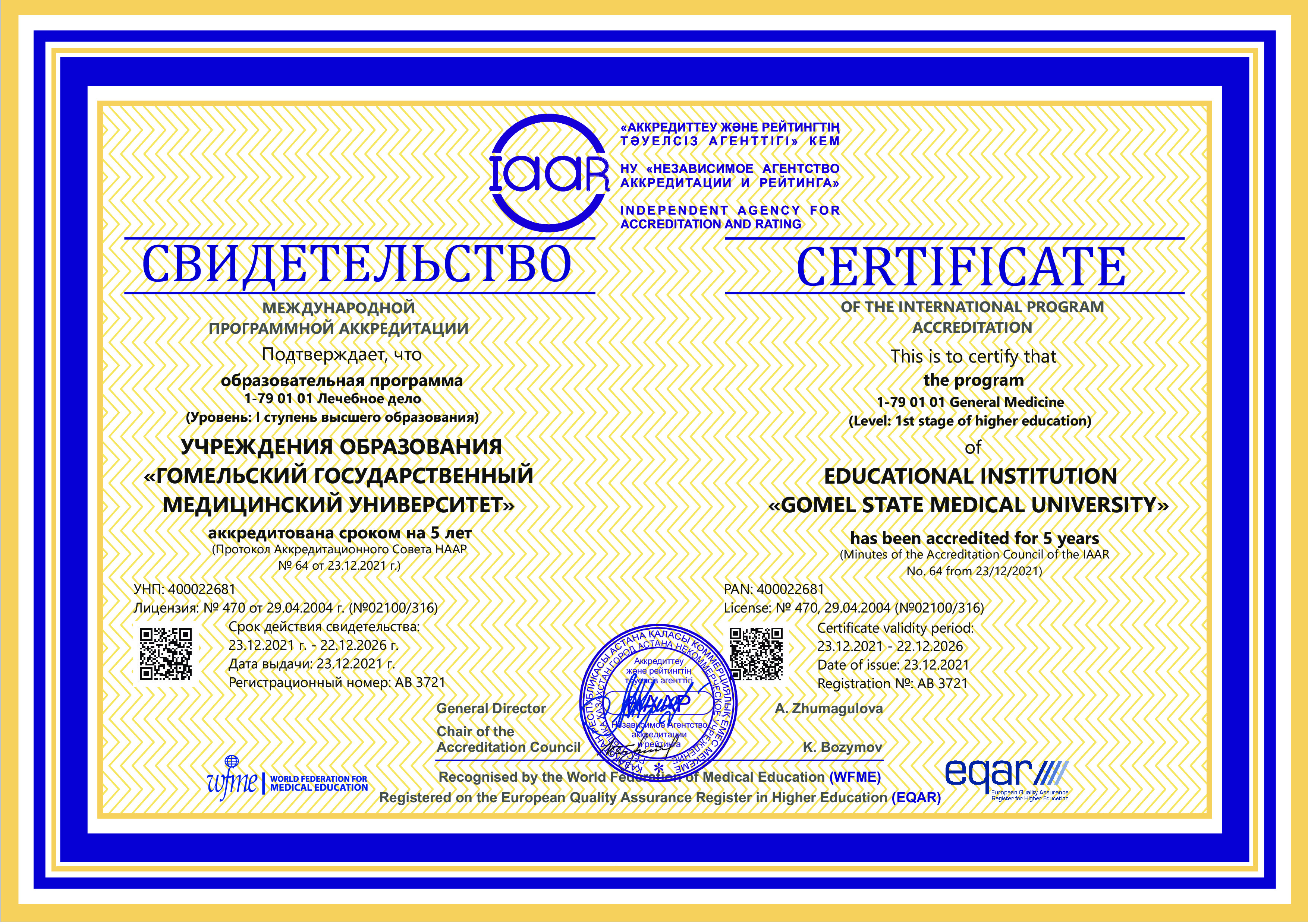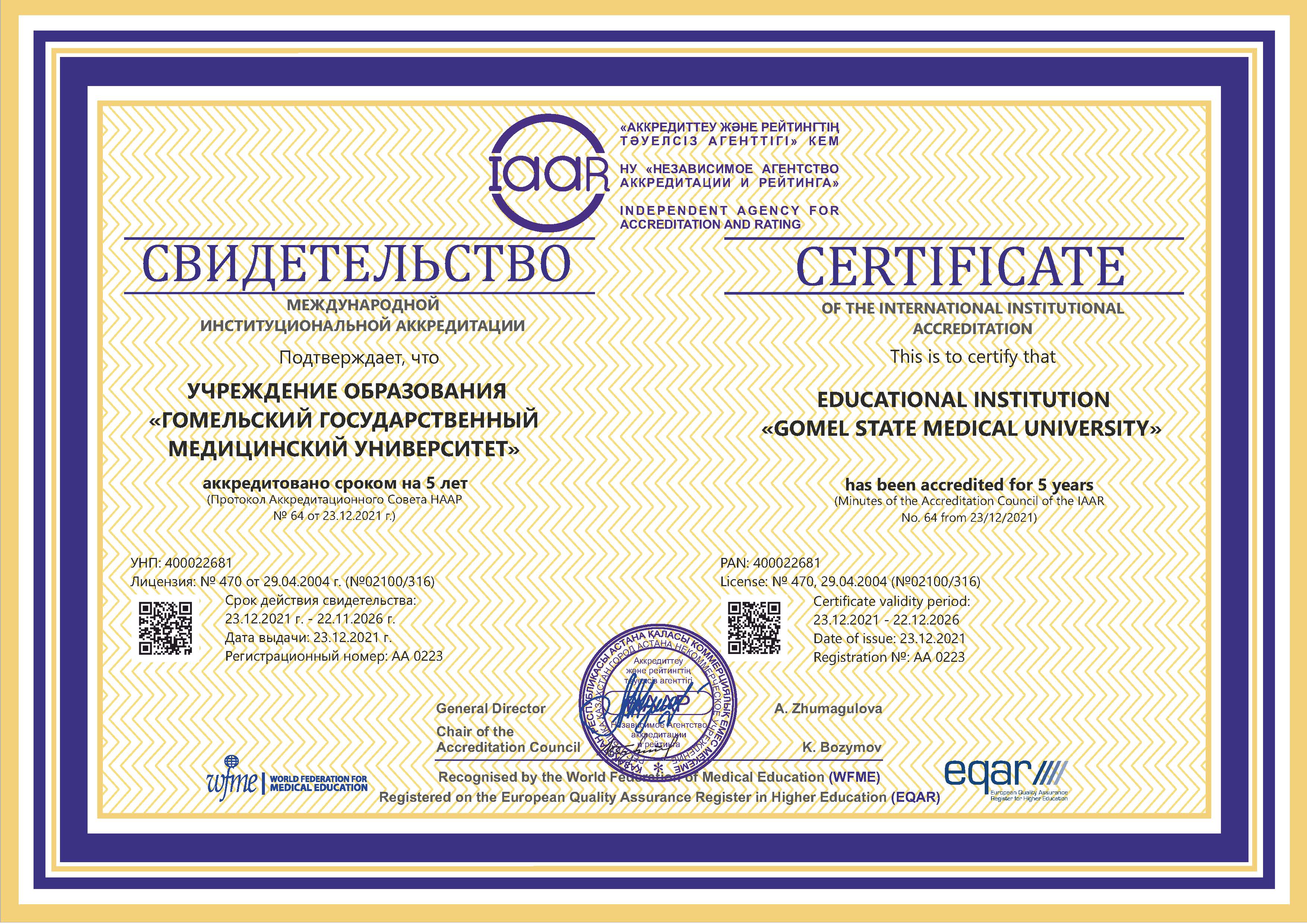 Цель международной институциональной аккредитации – оценка и признание высокого качества деятельности университета и реализуемых образовательных программ в соответствии с международными стандартами аккредитации и руководствами Всемирной федерации медицинского образования (WFME).
