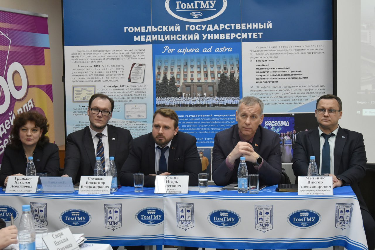 На встречу с возможно будущими руководителями пришли нынешние руководители: ректор ГомГМУ, профессор Игорь Олегович Стома, проректор по учебной работе, профессор Виктор Александрович Мельник, проректор по лечебной работе, доцент Владимир Владимирович Похожай, декан лечебного факультета, доцент Наталья Леонидовна Громыко, начальник отдела кадровой работы и награждений Гомельского облисполкома Сергей Иванович Горбач.