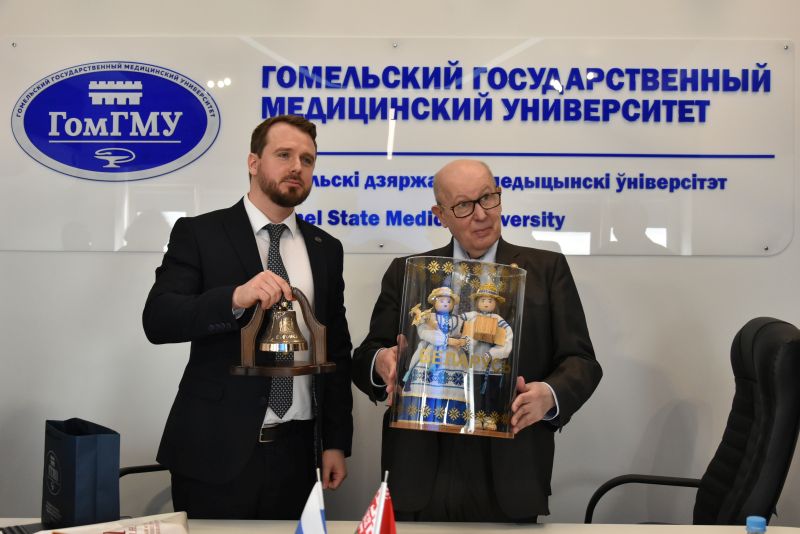 На встрече руководителей университетов — ректора Гомельского государственного медицинского университета, д.м.н., профессора Игоря Олеговича Стомы и ректора Воронежского государственного медицинского университета им. Н.Н. Бурденко, д.м.н., профессора Игоря Эдуардовича Есауленко обсуждались вопросы сотрудничества в сфере науки и образования.