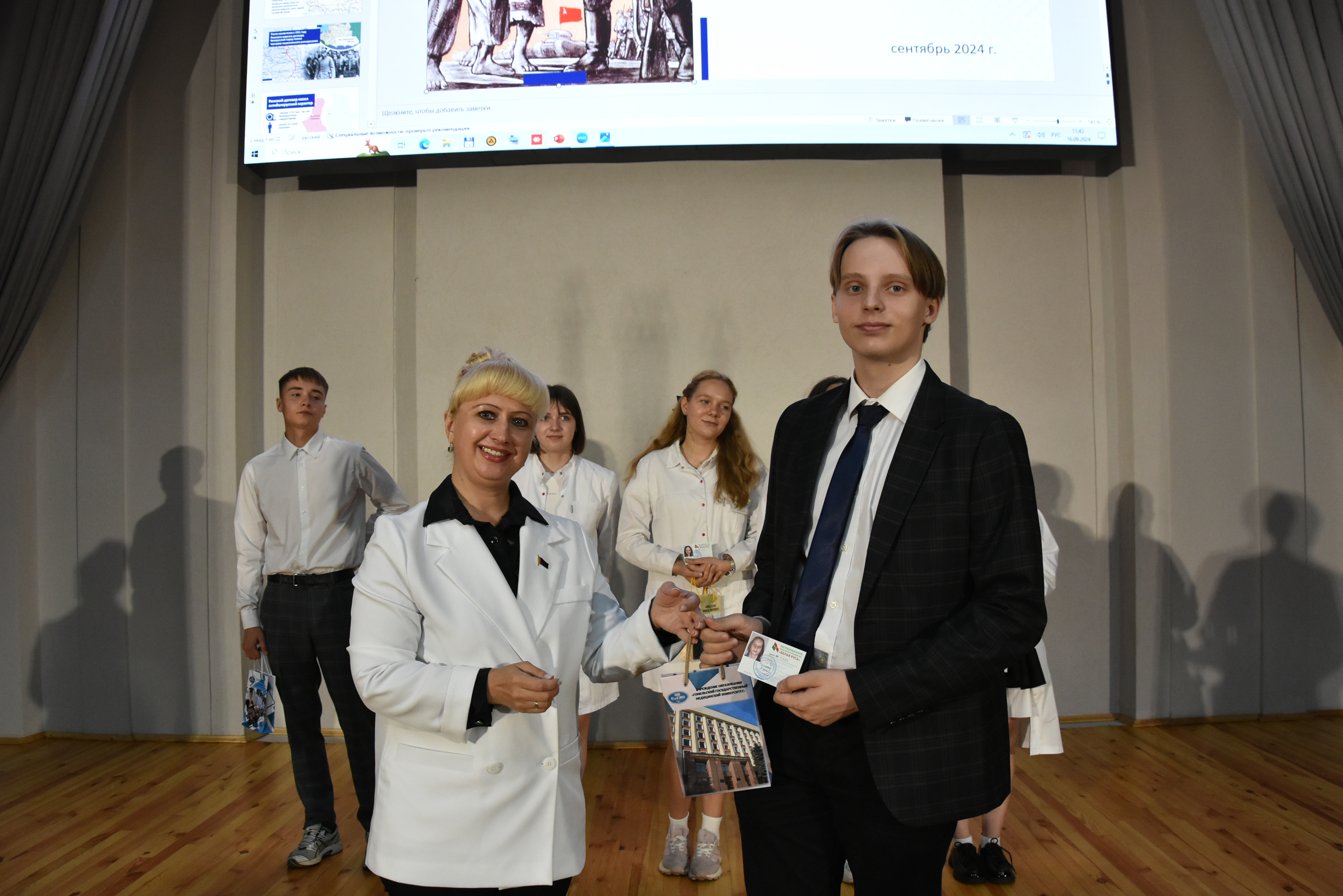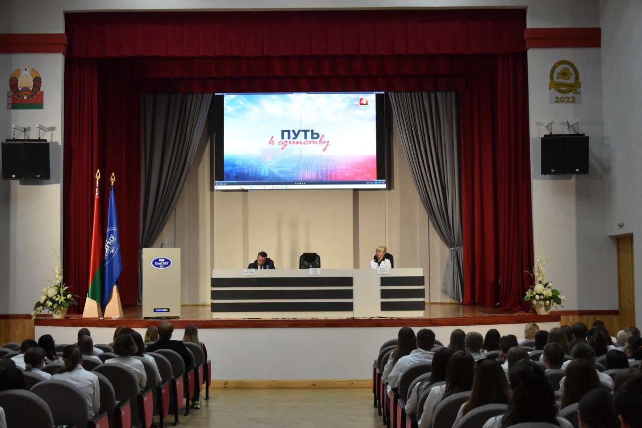 На мероприятии выступила председатель РОО «Белая Русь» Марина Сергеевна Пашковская. В своей деятельности «Белая Русь» сотрудничает с передовой молодежью, заинтересованной в активном участии в жизни страны и всесторонне поддерживает инициативу молодежи. В преддверии Дня народного единства в торжественной обстановке вручены студентам членские билеты.