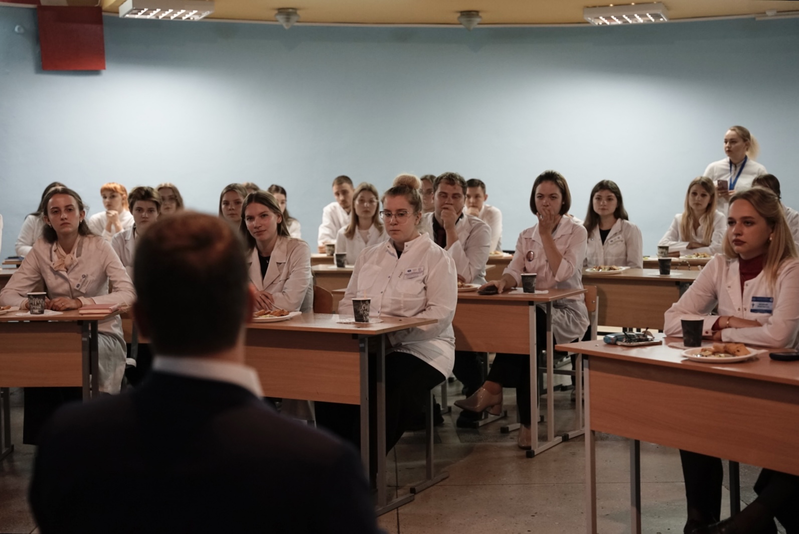 В нашем университете учатся почти четыре тысячи студентов. Более пятидесяти получили возможность поучаствовать в разговоре с ректором. В лекционном зале собрались руководители и участники студсоветов университета и факультетов, участники общественных организаций БРСМ, БСЖ, «Белая Русь», волонтерского движения.