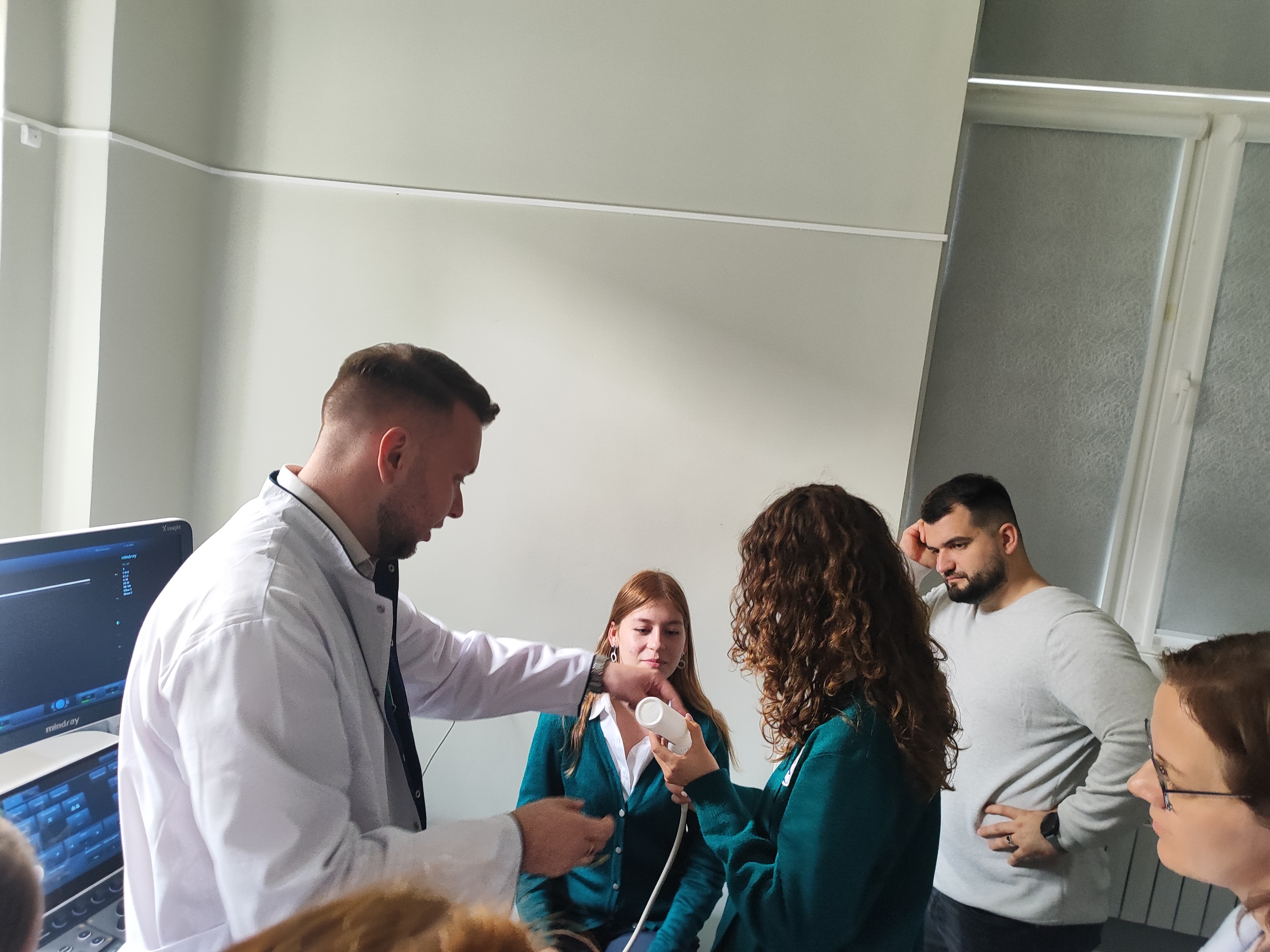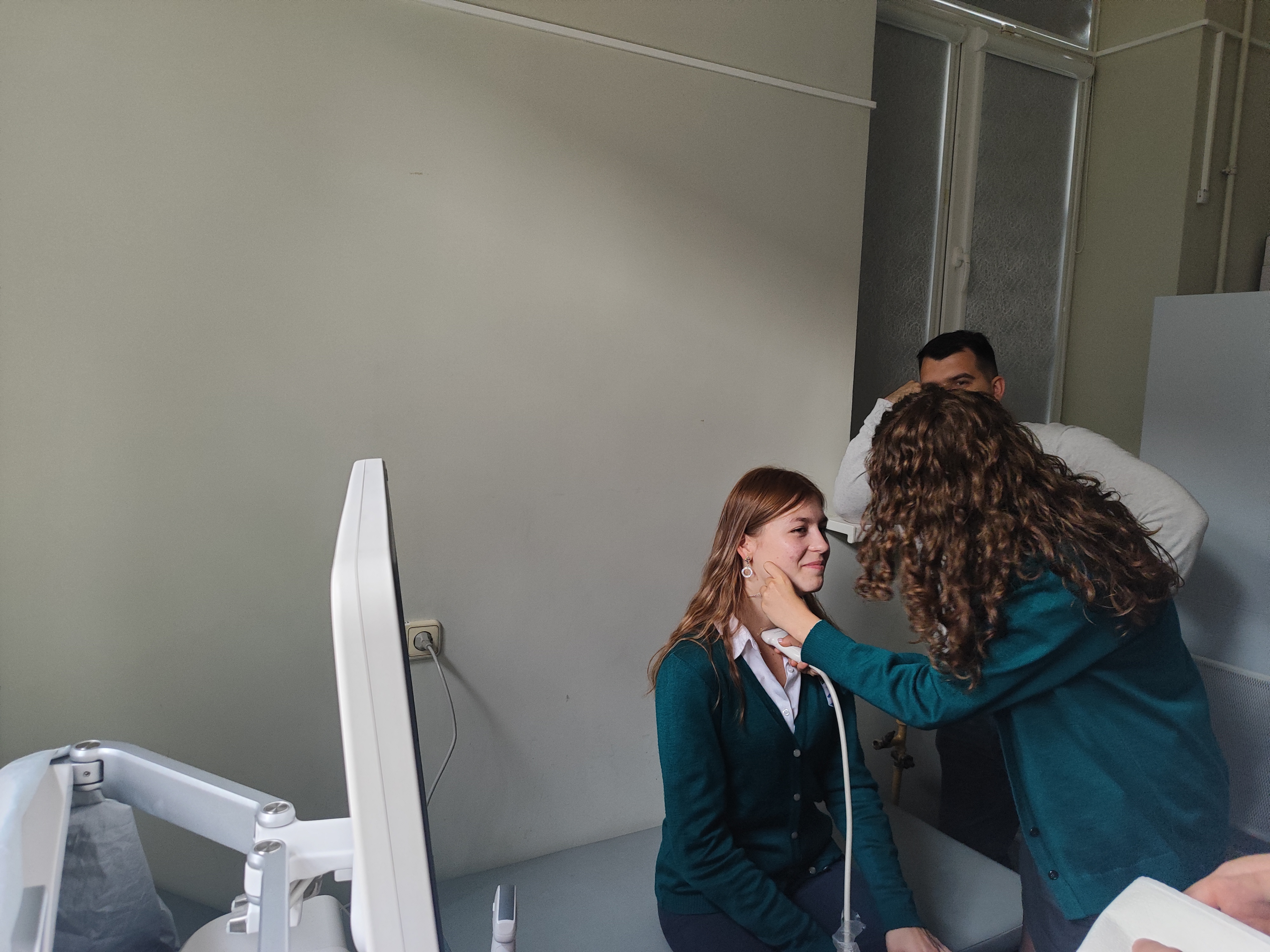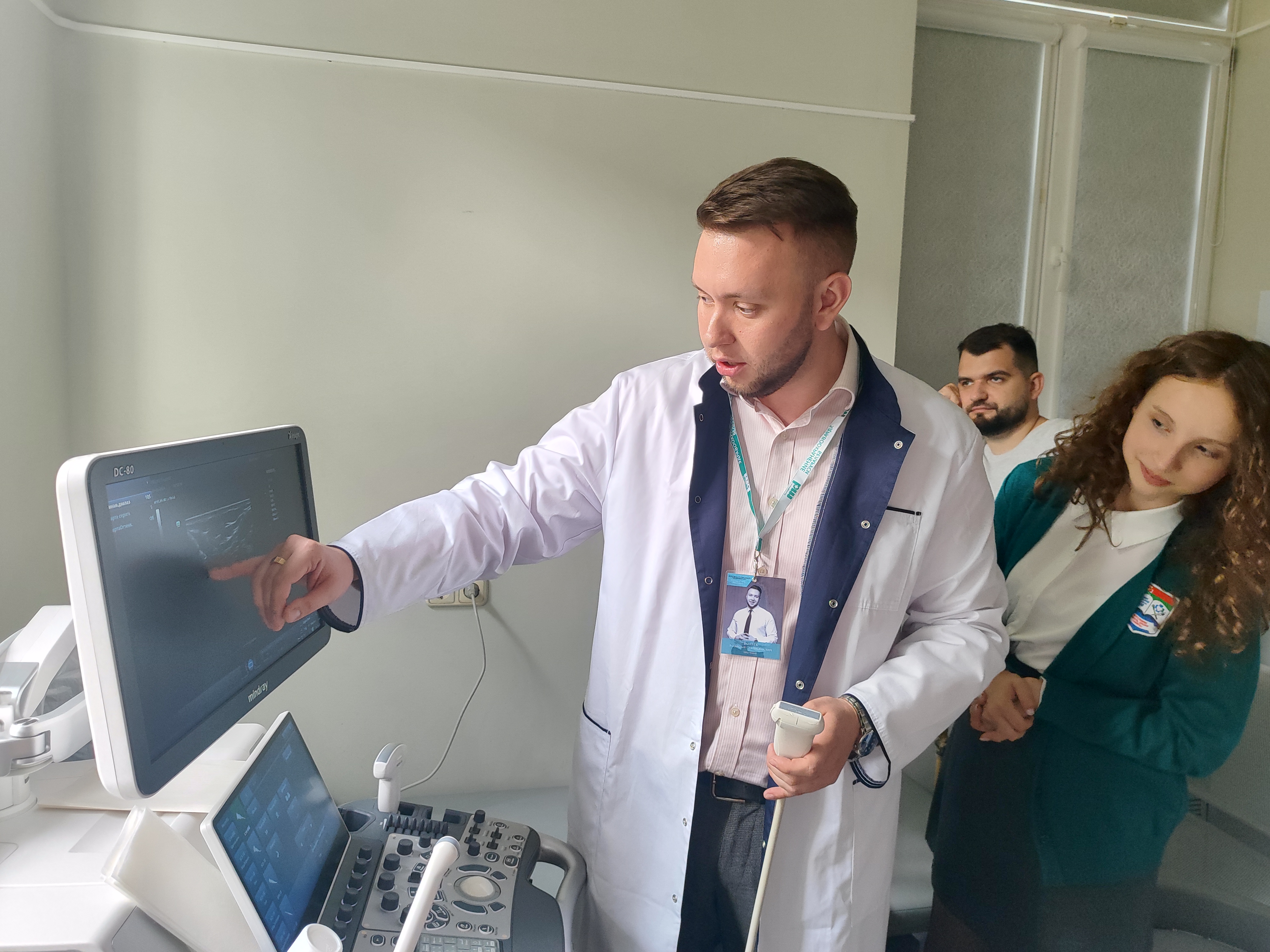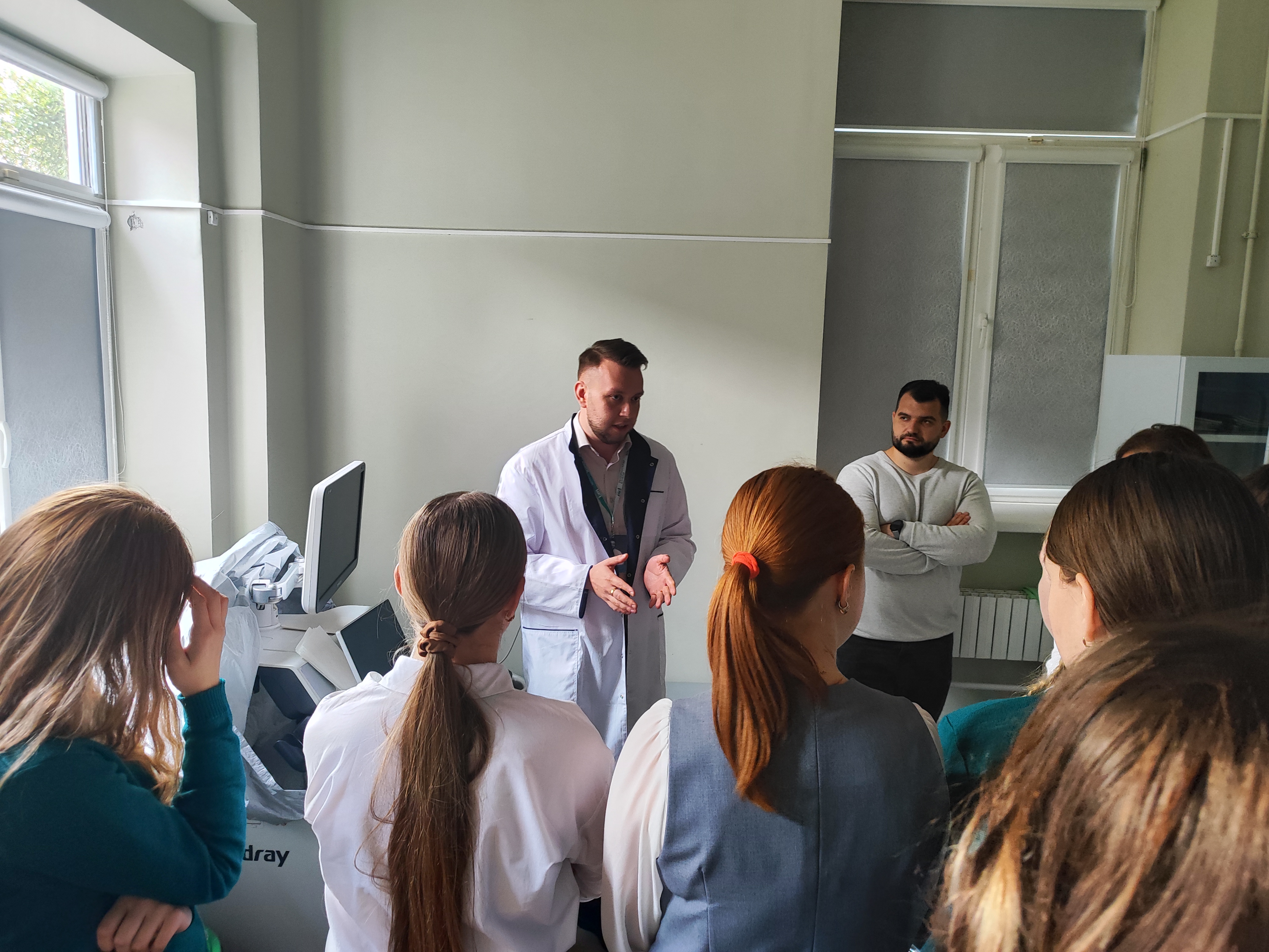 В.С.Волчек рассказал учащимся о работе центра, о том, что здесь можно получить консультацию высококвалифицированных специалистов из числа профессорско-преподавательского состава университета. Владислав Станиславович наглядно продемонстрировал работу аппарата УЗИ, электрокардиографа, причём ребята с удовольствием принимали участие в «тестировании» медицинского оборудования, на себе прочувствовав работу врачей-консультантов.