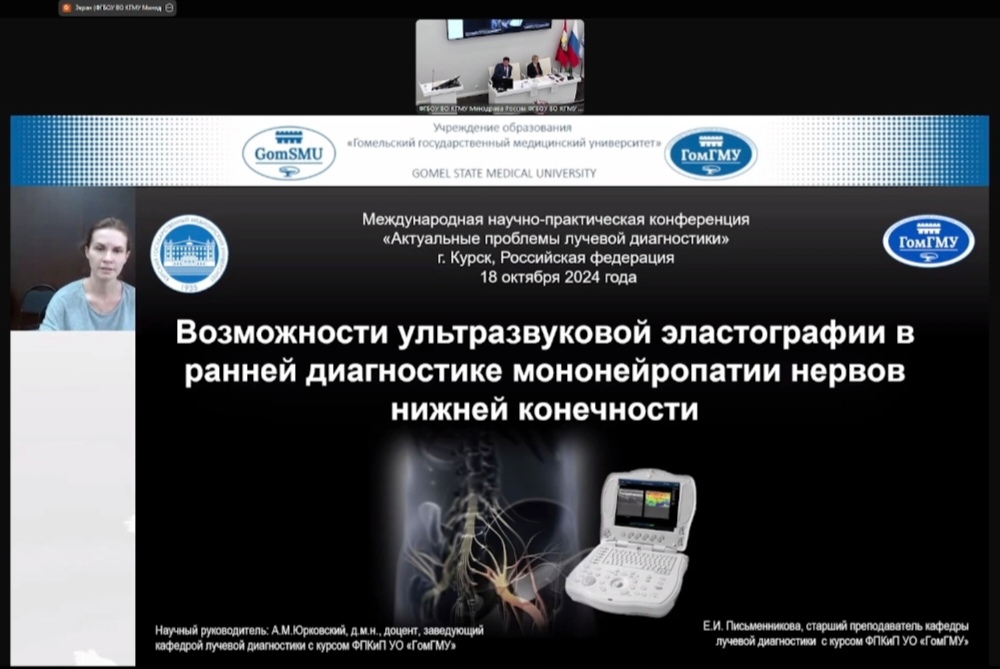 Старший преподаватель кафедры Евгения Игоревна Письменникова выступила с докладом "ВОЗМОЖНОСТИ УЛЬТРАСОНОЭЛАСТОГРАФИИ В ДИАГНОСТИКЕ МОНОНЕВРОПАТИИ СЕДАЛИЩНОГО НЕРВА"