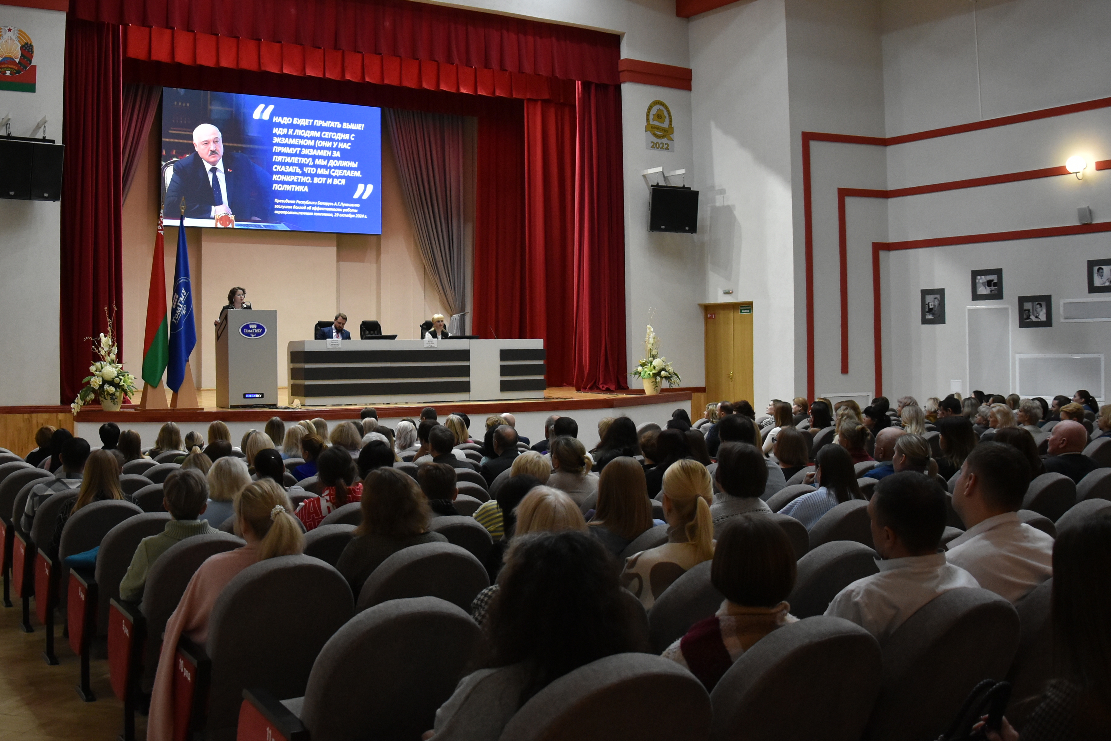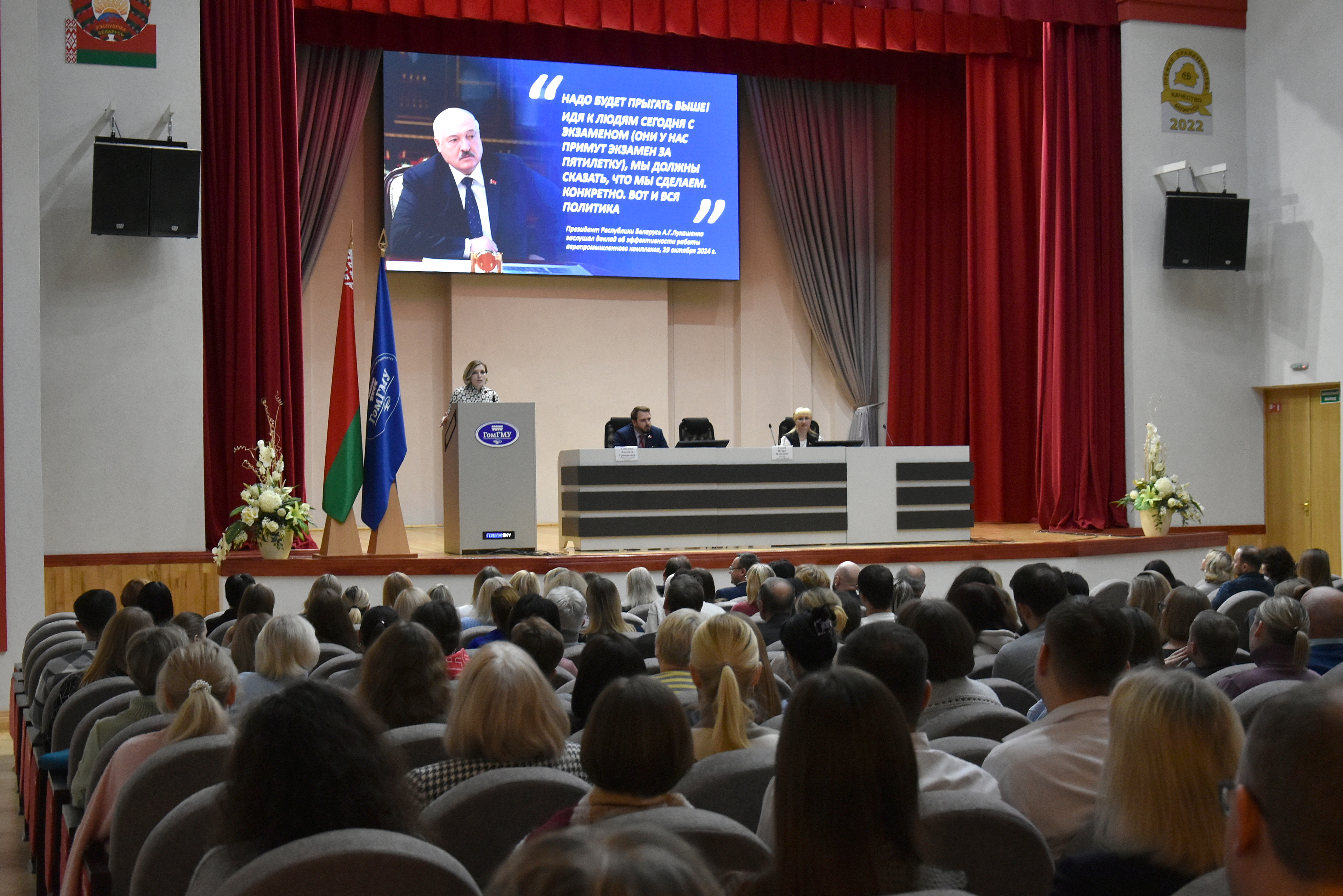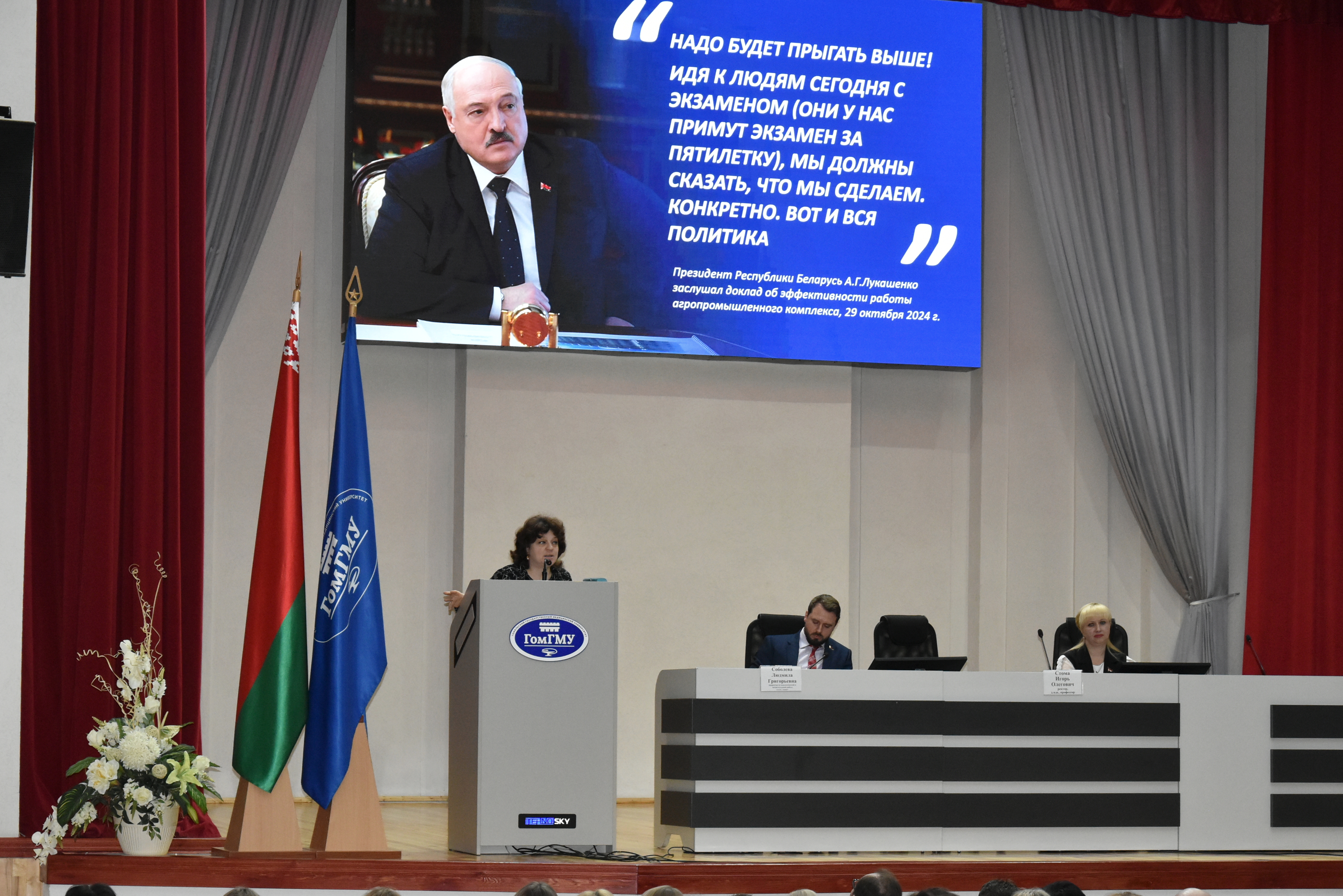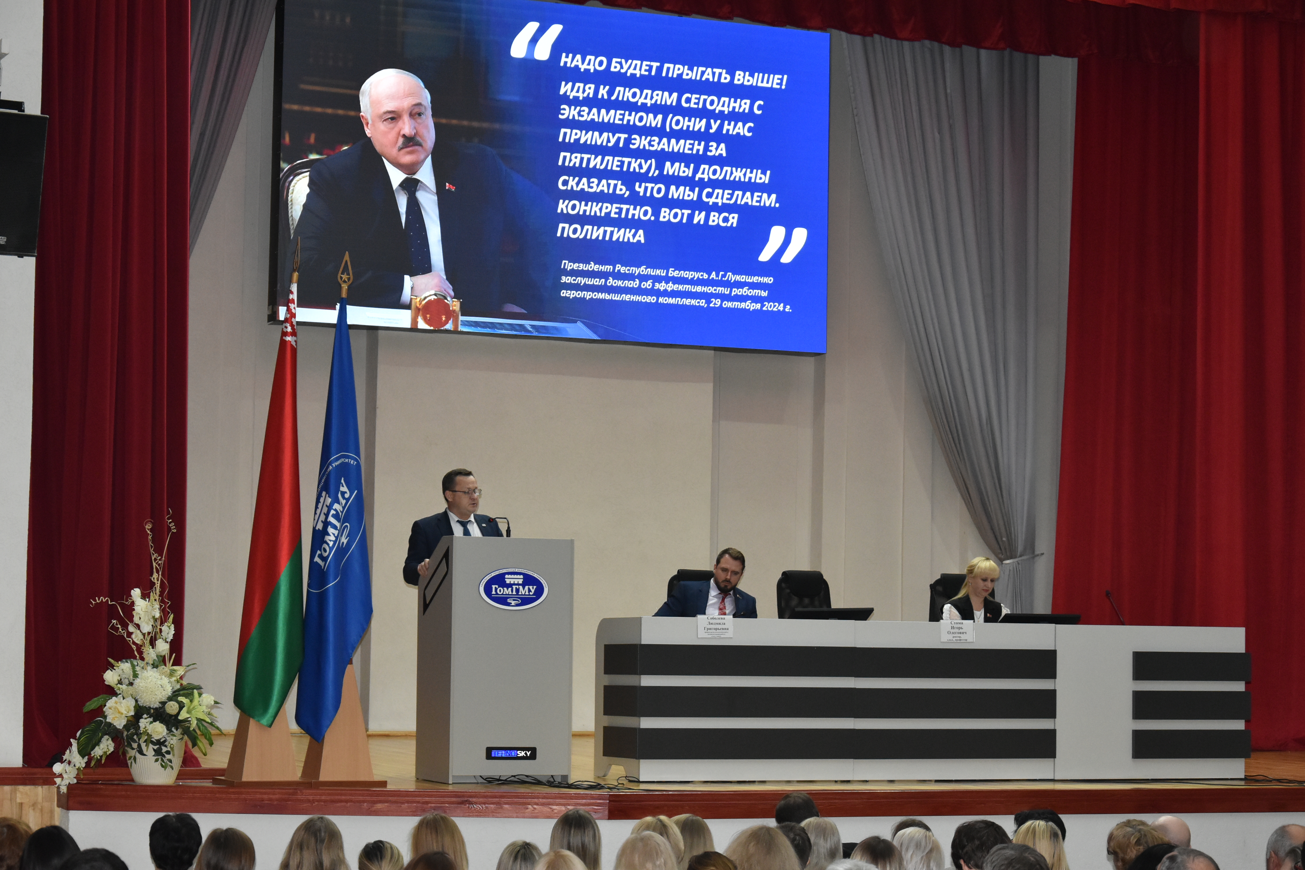 Перед коллективом университета выступил ректор ГомГМУ профессор Игорь Олегович Стома. В своей речи Игорь Олегович отметил, что суверенитет любого государства в значительной степени зависит от способности руководителя страны проводить эффективную политику в сфере национальной безопасности. Нынешним поколениям белорусов посчастливилось родиться и жить под мирным небом. И в этом заслуга сильного Президента.