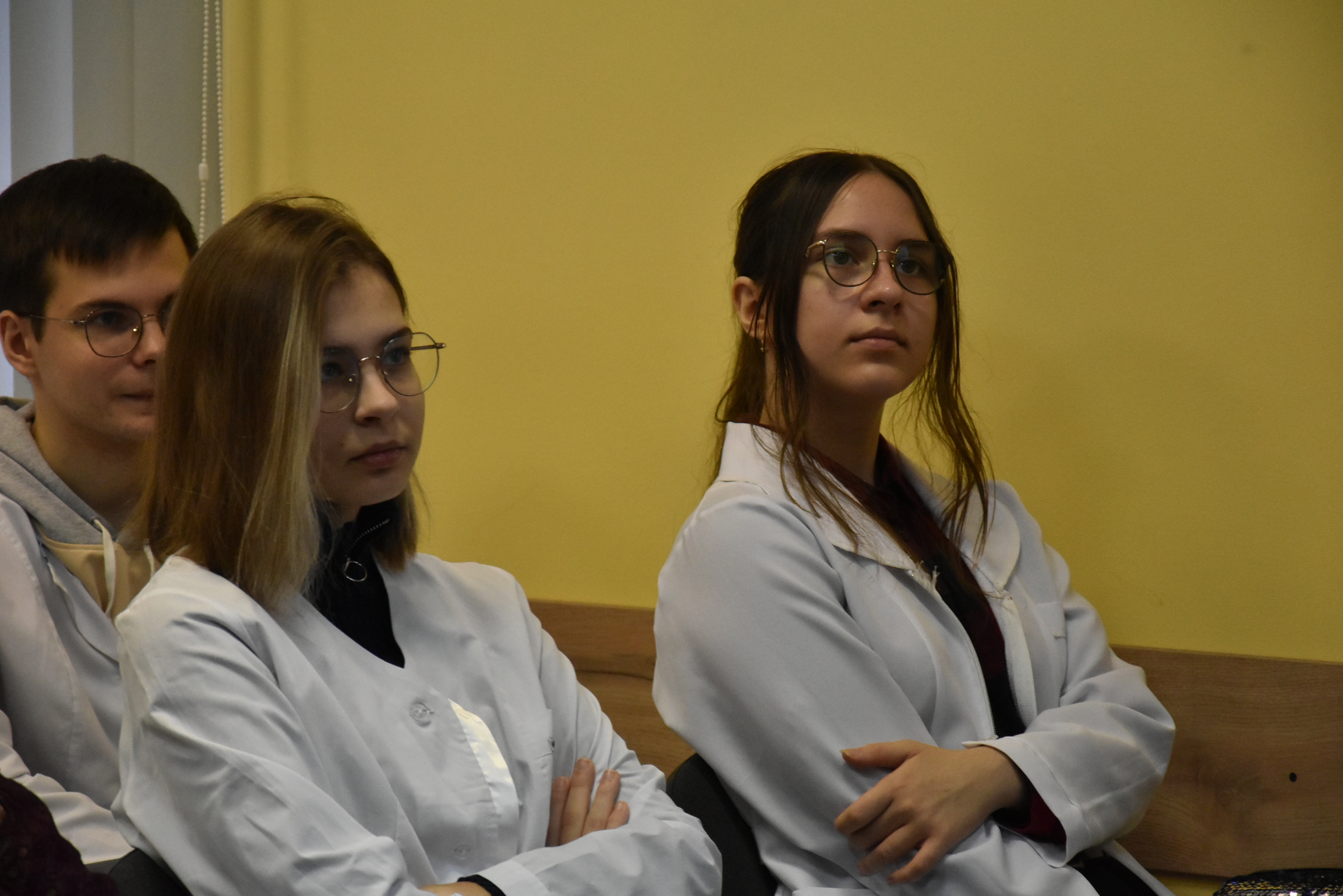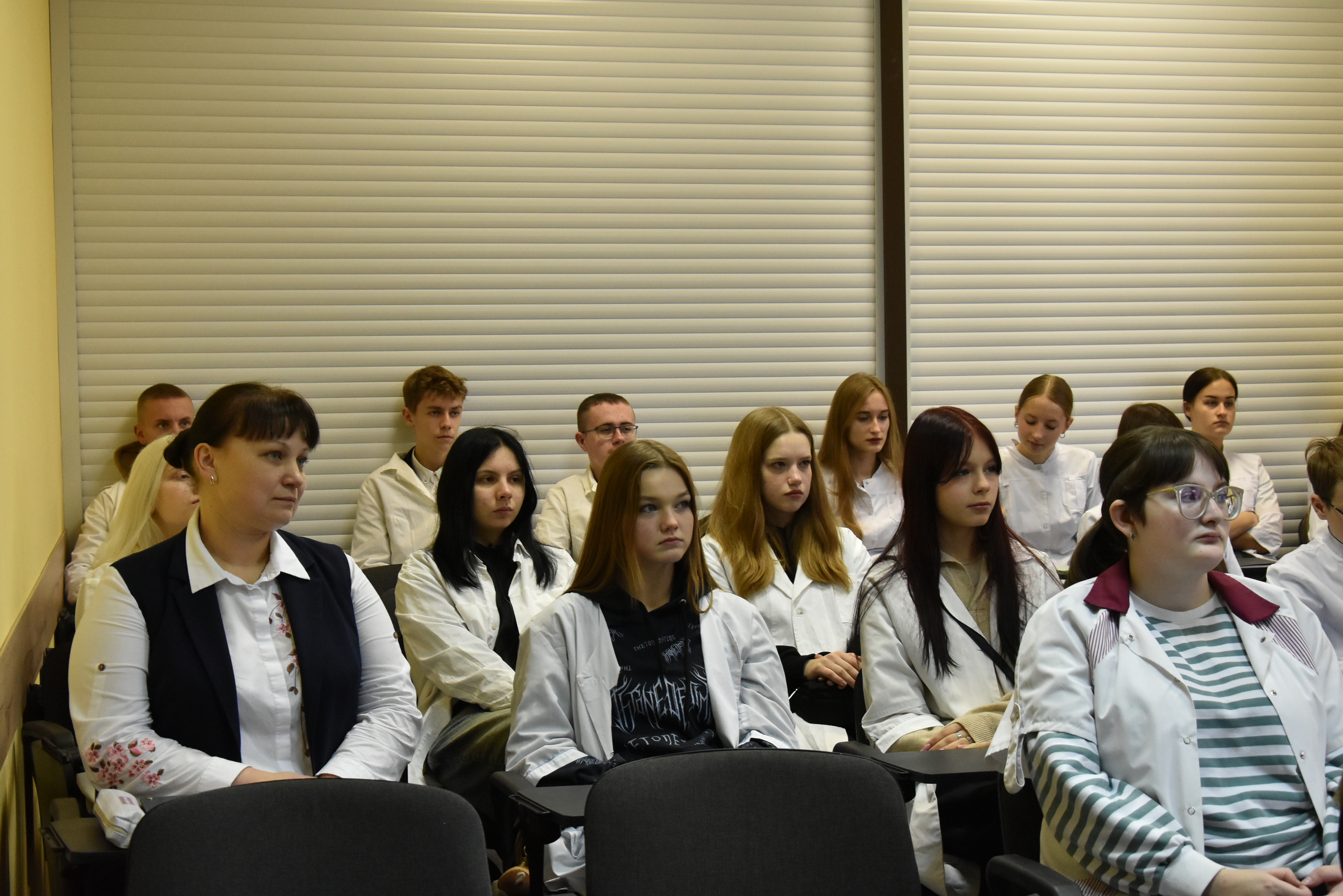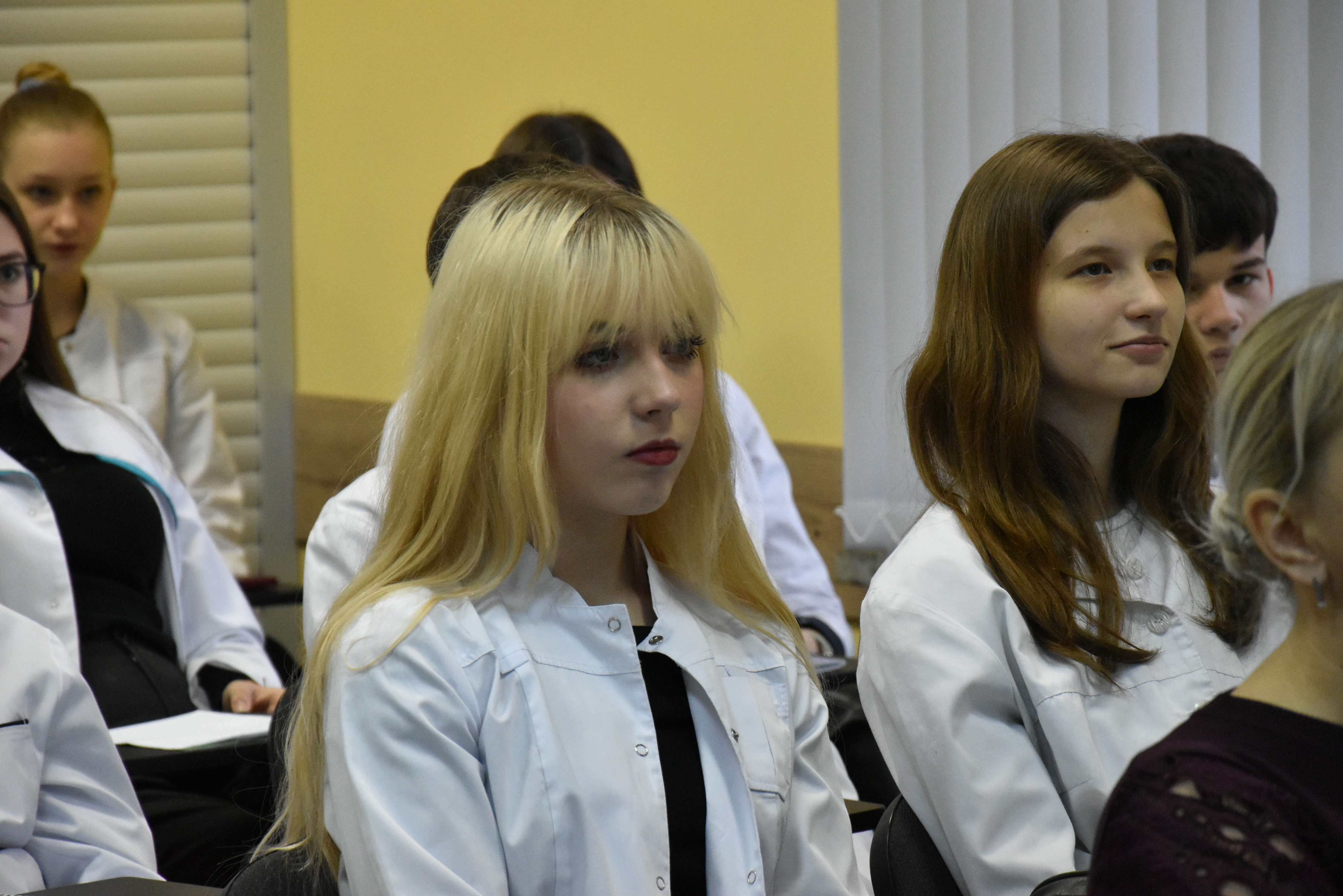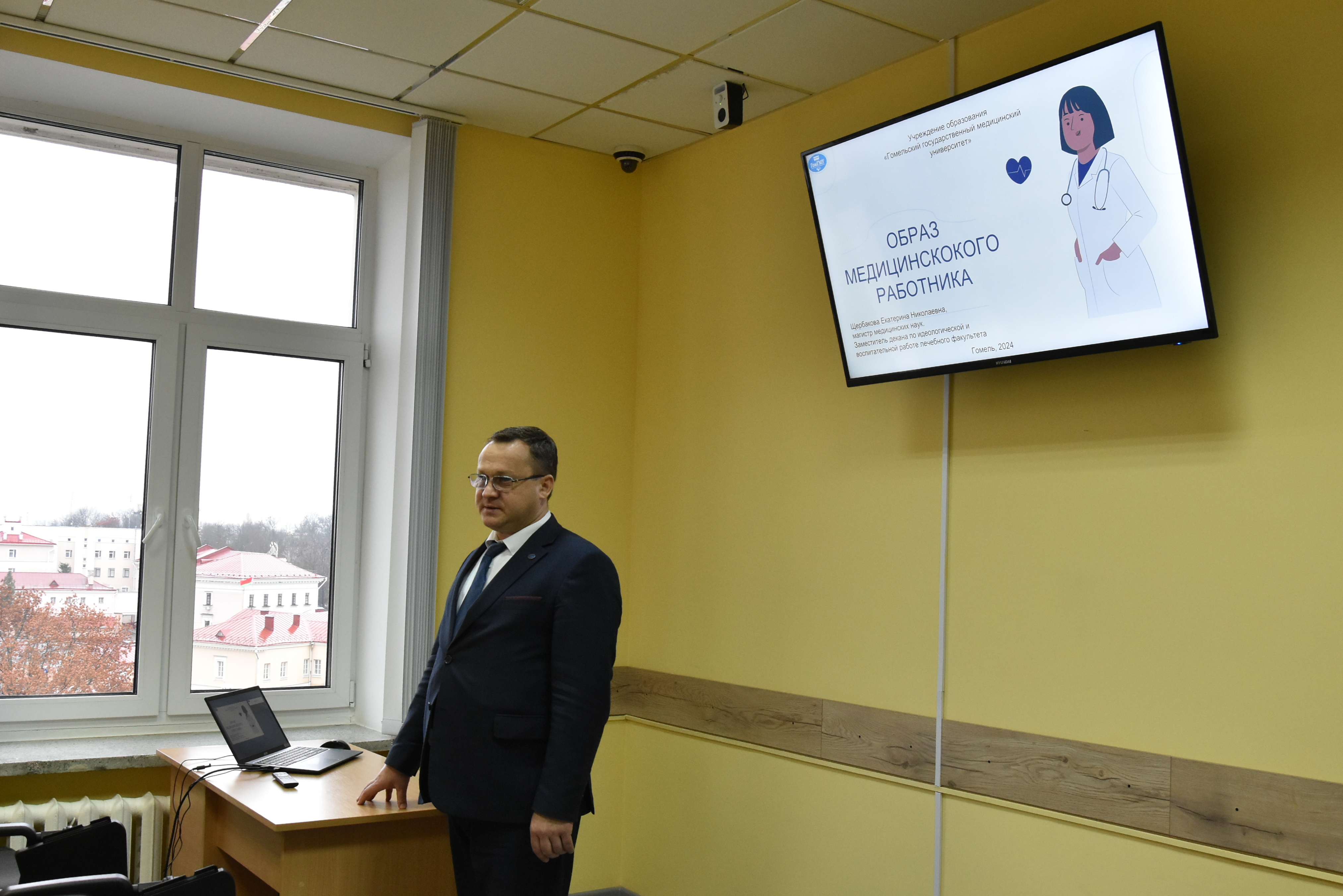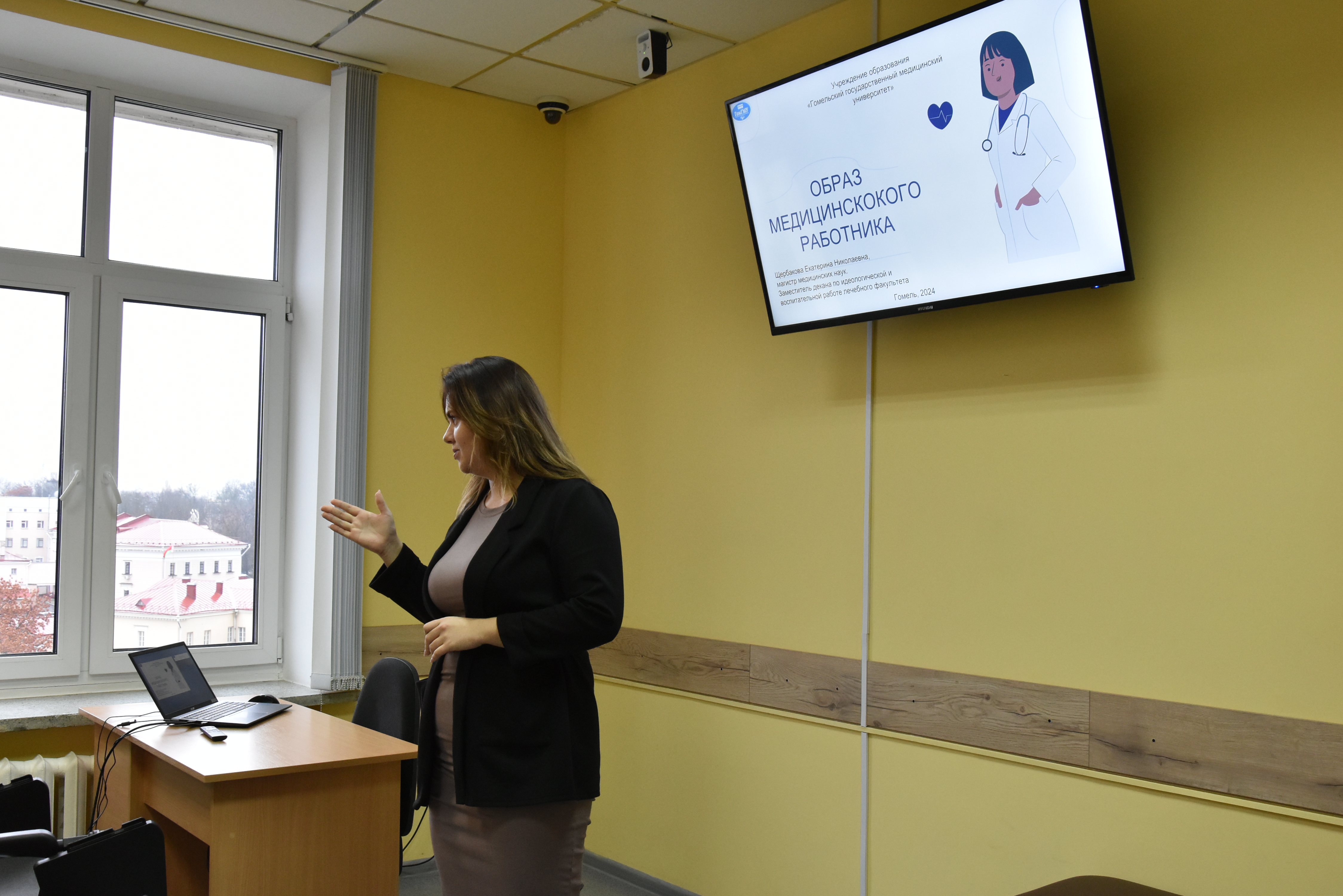 Екатерина Николаевна Щербакова, заместитель декана по идеологической и воспитательной работе лечебного факультета, познакомила школьников с образом медицинского работника. В центре внимания были профессиональные качества медицинского работника Республики Беларусь, высшие моральные ценности врача, понятие о биомедицинской этике и деонтологии. Екатерина Николаевна рассказала о гарантиях и защите прав медицинских, фармацевтических работников. Ребята познакомились с клятвой Гиппократа, а также узнали, что представляет собой ОСКЭ.