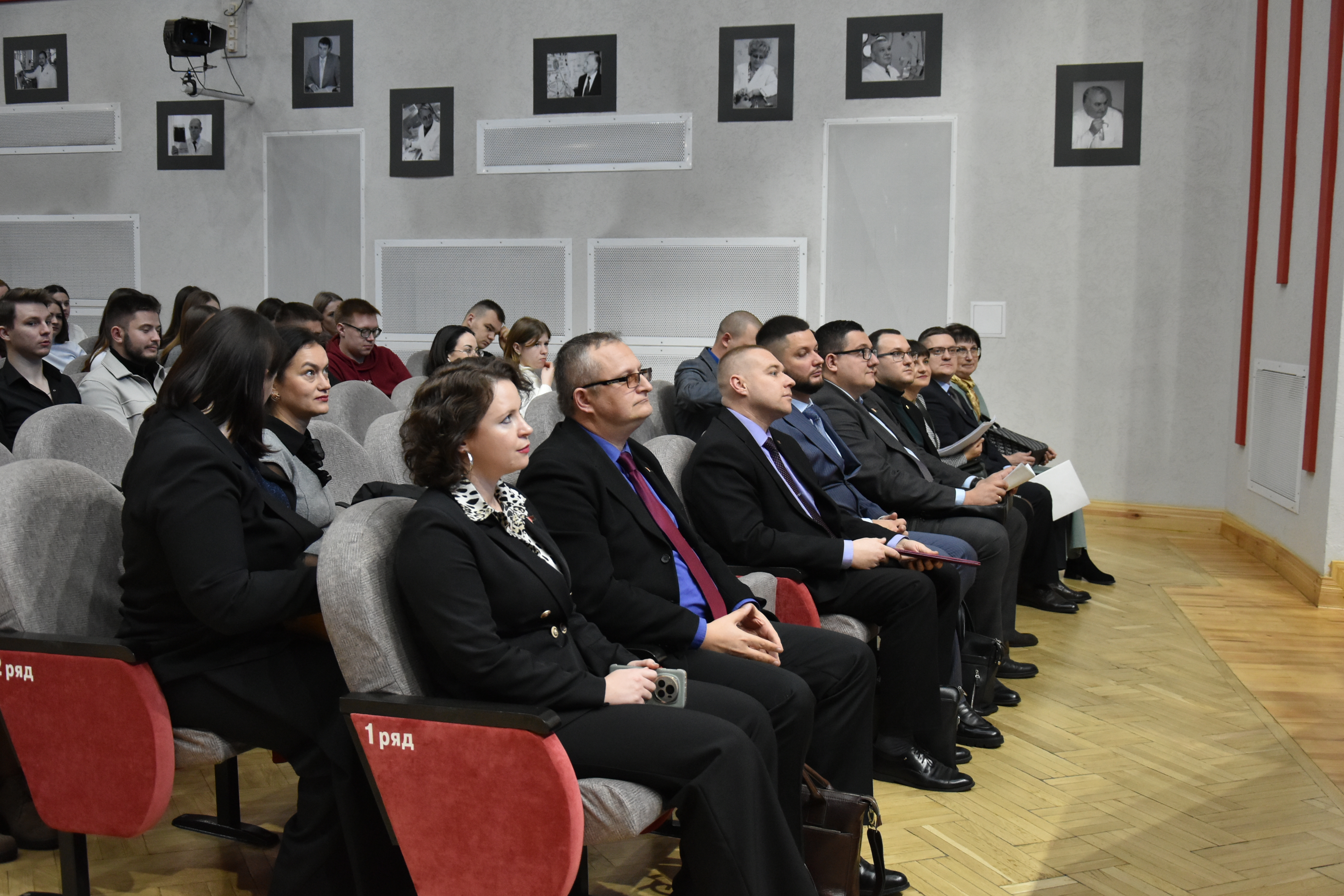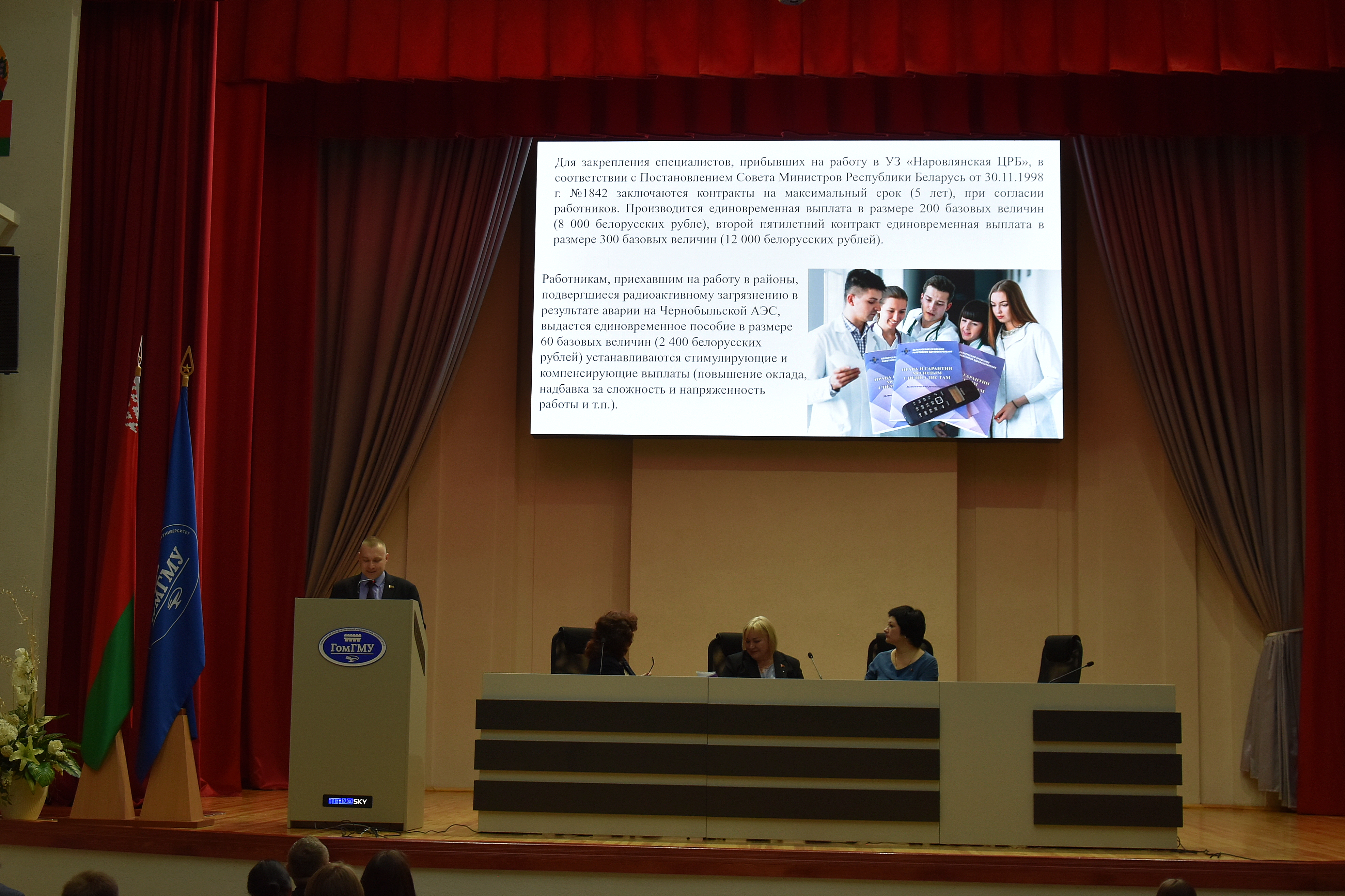 На встрече с будущими коллегами присутствовали: председатель Гомельской областной организации Белорусского профсоюза работников здравоохранения Надежда Александровна Зимина, начальник отдела кадров ГУЗО Гомельского областного исполнительного комитета Людмила Валентиновна Печурина, проректор по лечебной работе ГомГМУ Владимир Владимирович Похожай, декан лечебного факультета Наталья Леонидовна Громыко, декан медико-диагностического факультета Ирина Вячеславовна Назаренко.
