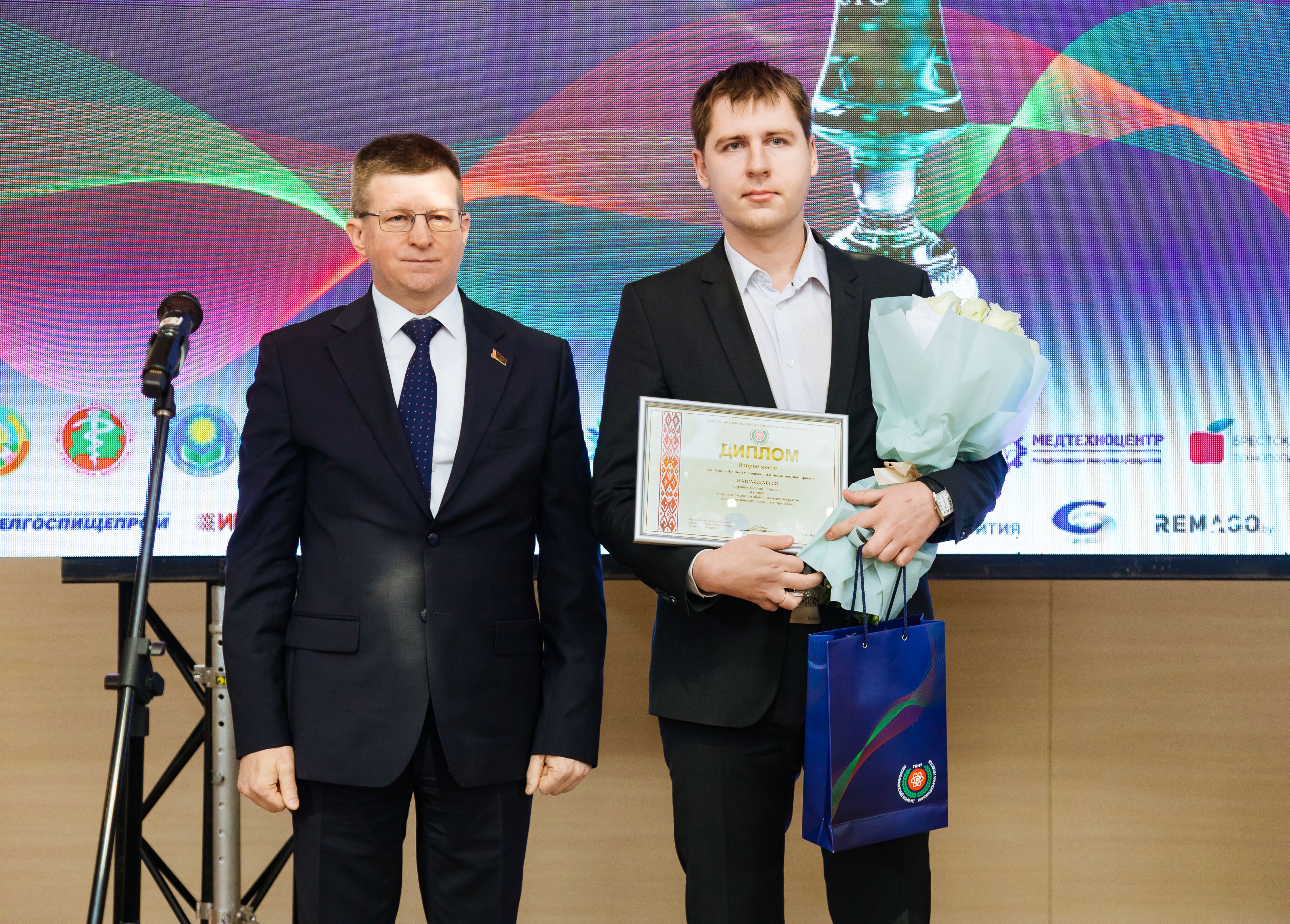 В ходе торжественного мероприятия председатель Государственного комитета по науке и технологиям Сергей Шлычков вручил награду за II место и диплом к.м.н., старшему преподавателю кафедры хирургических болезней № 1 с курсом сердечно-сосудистой хирургии Евгению Дорошко за проект «Биосовместимое антибактериальное покрытие для синтетических сосудистых протезов».