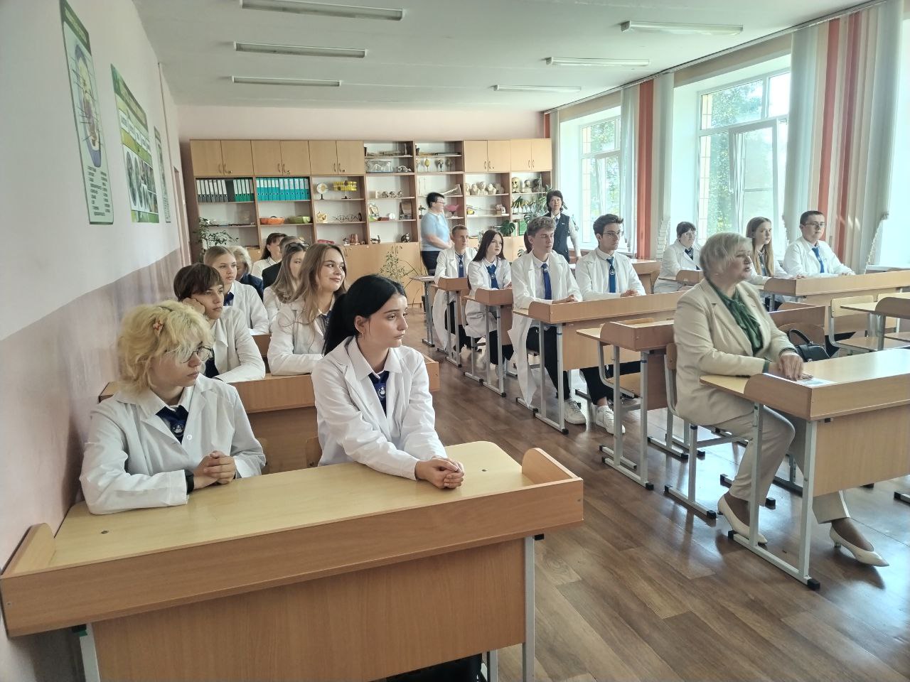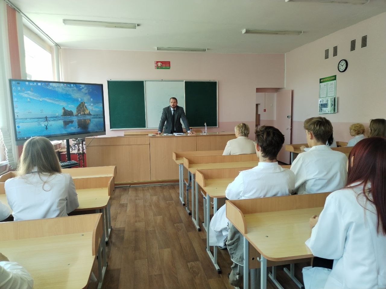 Участие в сегодняшней встрече с учениками медицинского класса приняли главный врач Речицкой ЦРБ Виталий Вячеславович Авдеев, председатель Гомельского областного объединения профсоюзов Елена Владимировна Кличковская, председатель Гомельской областной организации профсоюза работников здравоохранения Надежда Александровна Зимина и проректор по лечебной работе Владимир Владимирович Похожай.