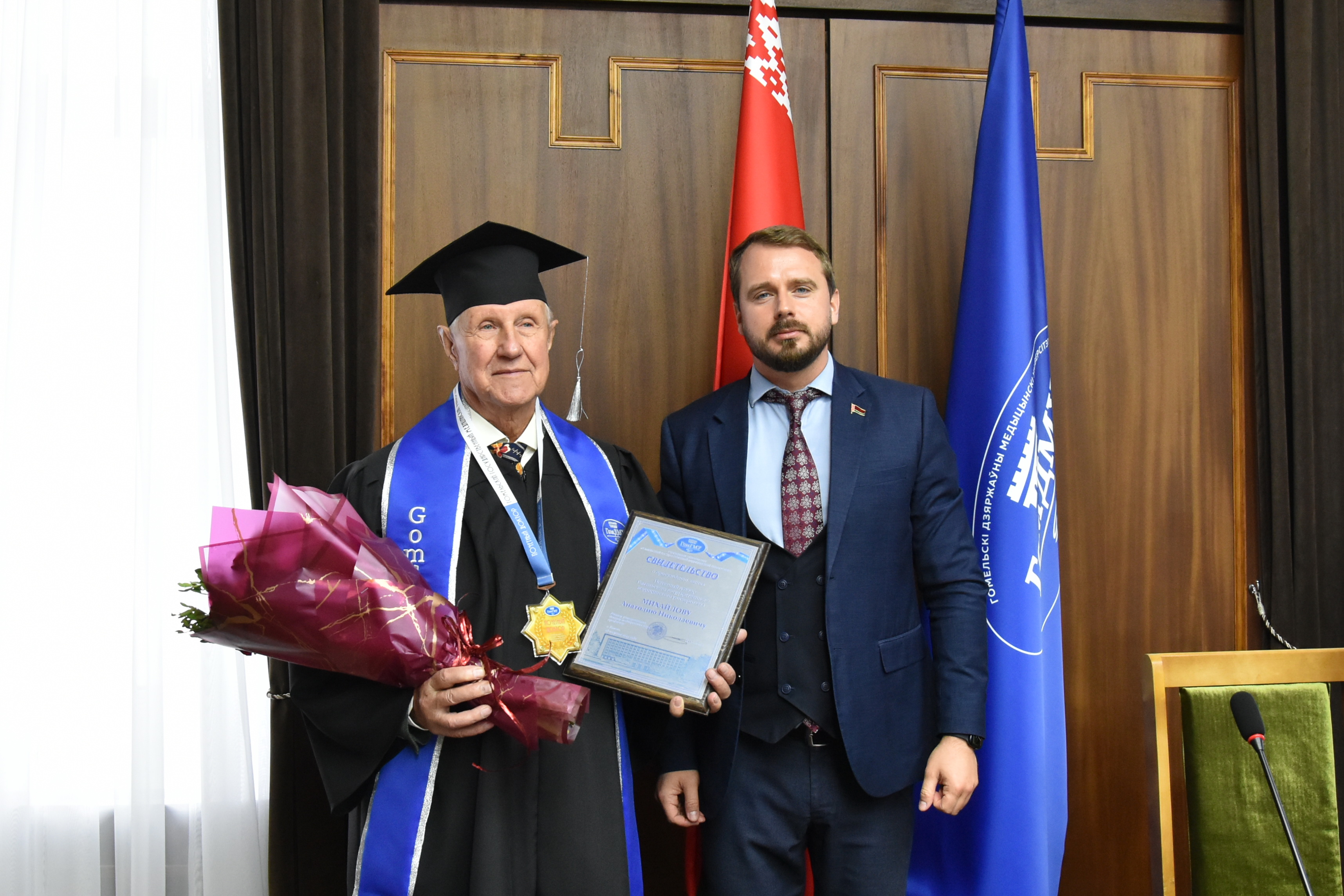 Ректор ГомГМУ профессор Игорь Олегович Стома вручил Анатолию Николаевичу свидетельство о присуждении почетного звания.