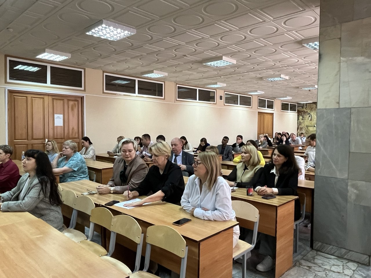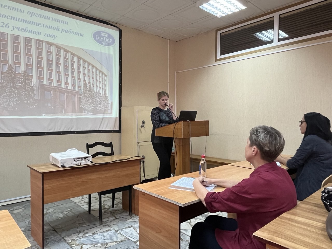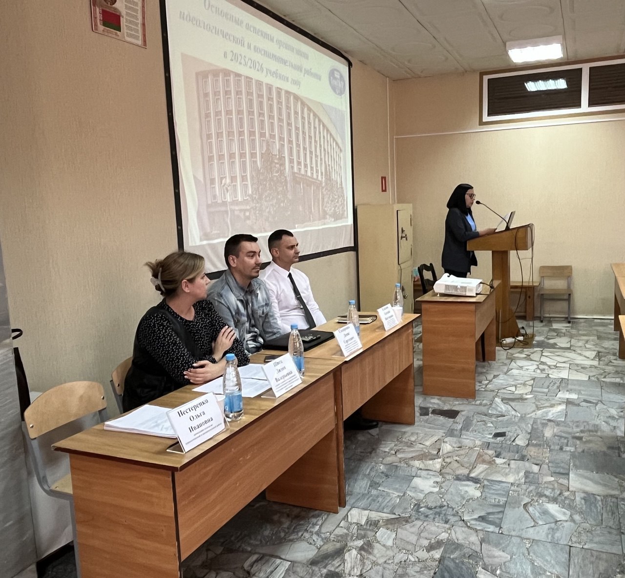 Начальник отдела по идеологической и воспитательной работе Ольга Ивановна Нестеренко раскрыла в своем выступлении основные аспекты организации идеологической и воспитательной работы в 2025/2026 учебном году, довела до сведения собравшихся резолюцию, принятую по итогам работы семинара в рамках проекта «Национальная школа ректоров», а также разъяснила содержание Директивы Президента Республики Беларусь от 09.04.2025 № 12 «О реализации основ идеологии белорусского государства».