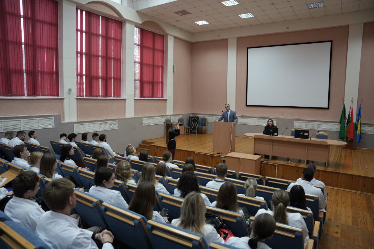 10 октября на базе Гомельской университетской клиники прошла теплая и продуктивная встреча главного государственного санитарного врача Могилевской области Максима Николаевича Саковича со студентами 4-5 курсов медико-профилактического факультета. Мероприятие стало мостом между поколениями, объединив опыт руководителя и энергию будущих специалистов.