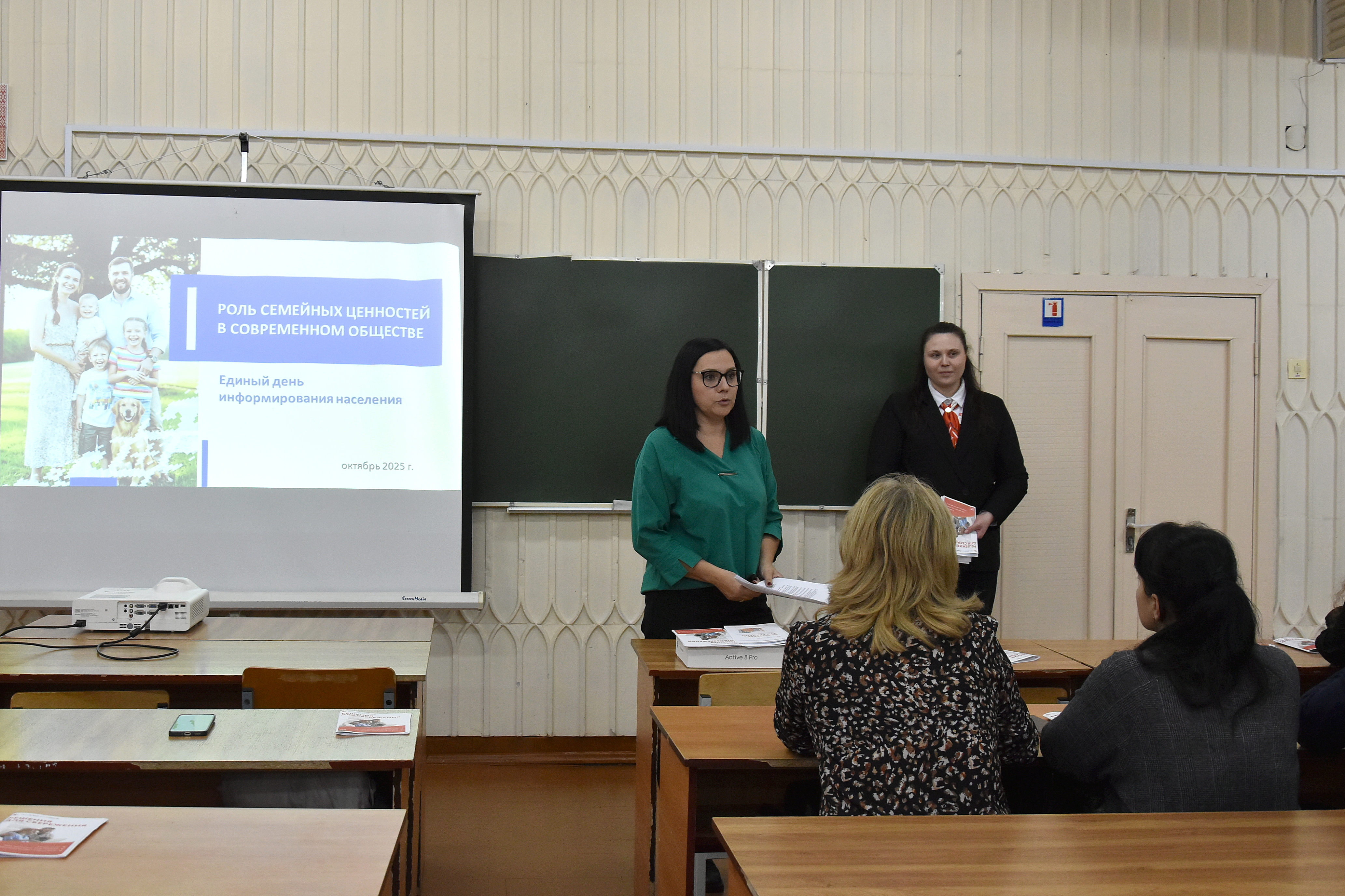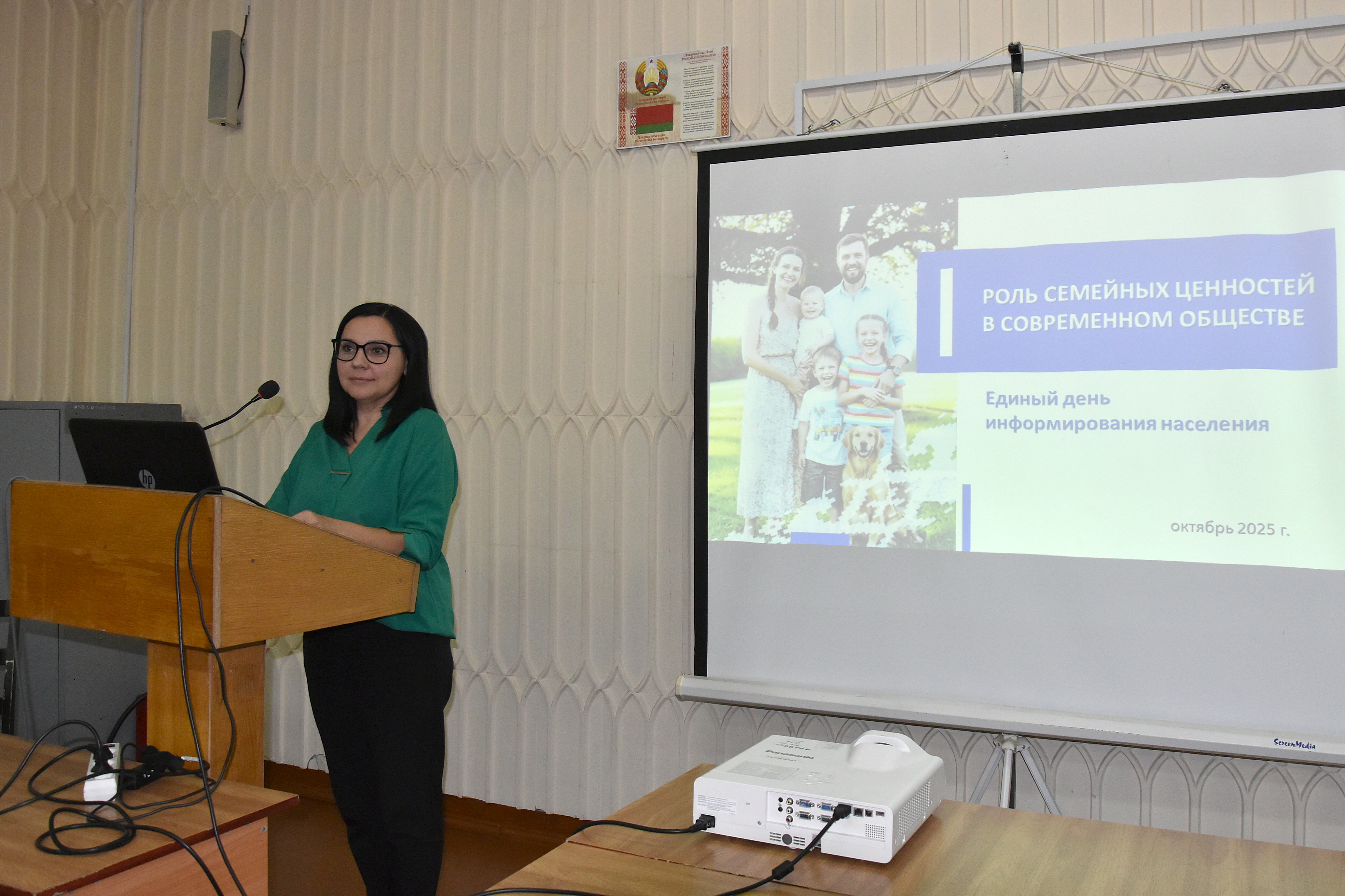 16 октября в университете состоялся единый день информирования по теме «Роль семейных ценностей в современном обществе». С основным докладом выступила начальник отдела по идеологической и воспитательной работе Ольга Ивановна Нестеренко. Было подчеркнуто, что крепкая семья – это не просто ячейка общества, а фундамент успешного развития и национальной безопасности государства.