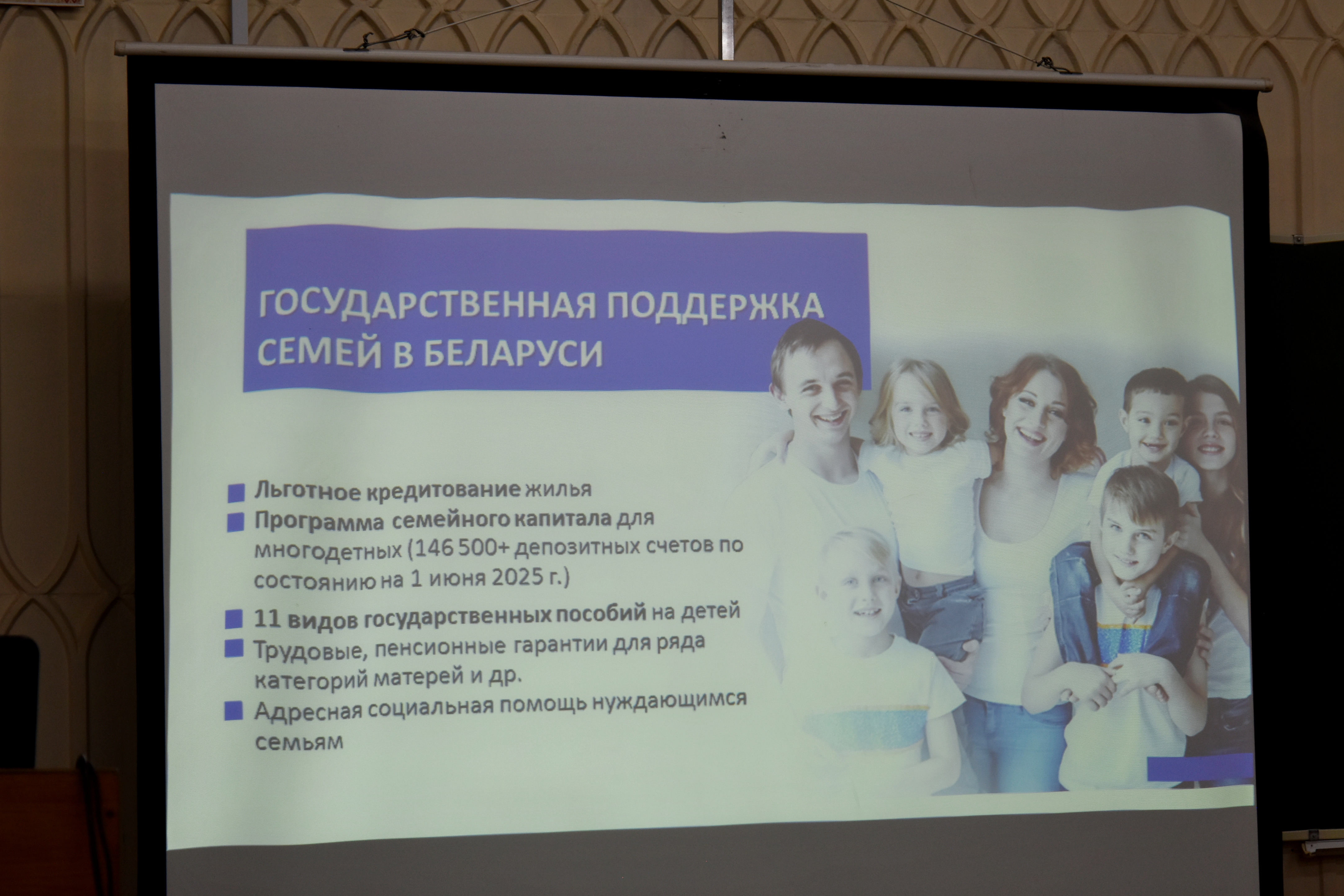 В заключение было отмечено, что популяризация семейного образа жизни требует системного подхода и личного участия каждого. Классическая модель семьи с детьми должна оставаться неизменным ориентиром. «Любите своих детей, цените родных и близких, берегите нашу любимую Беларусь!» – завершила свое выступление Ольга Ивановна, призвав университетское сообщество быть активными проводниками и хранителями вечных ценностей.