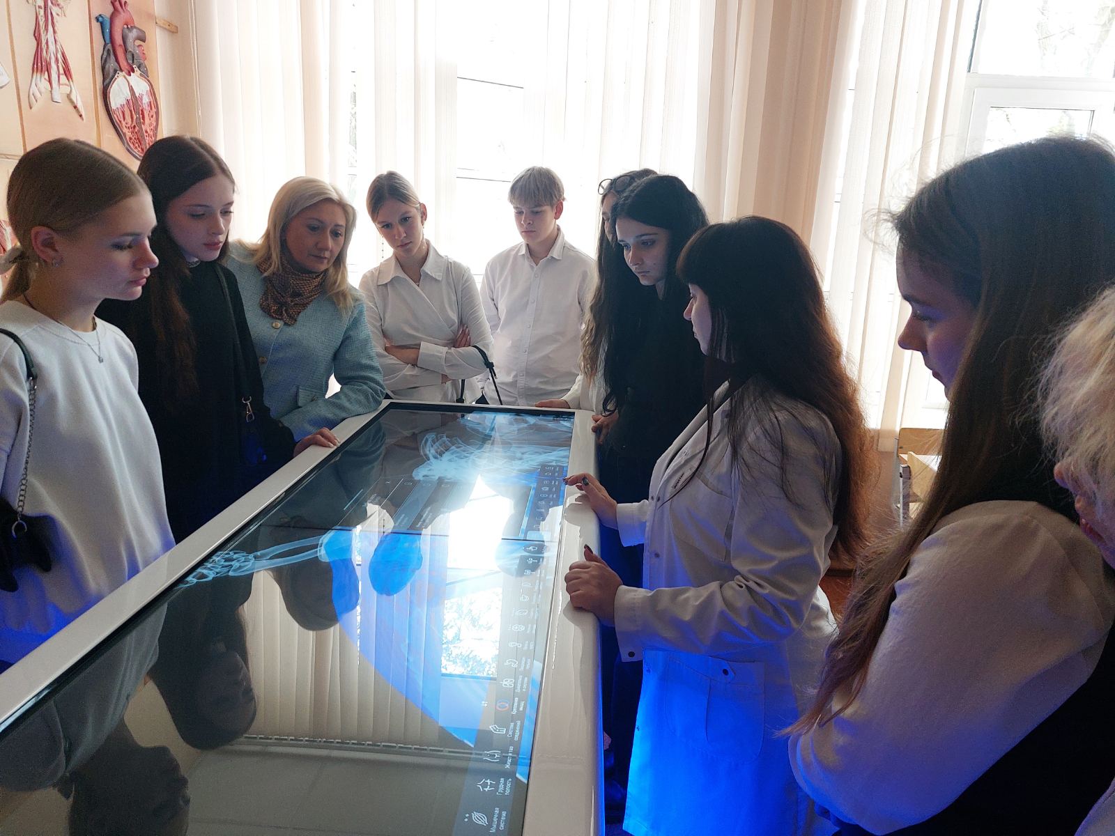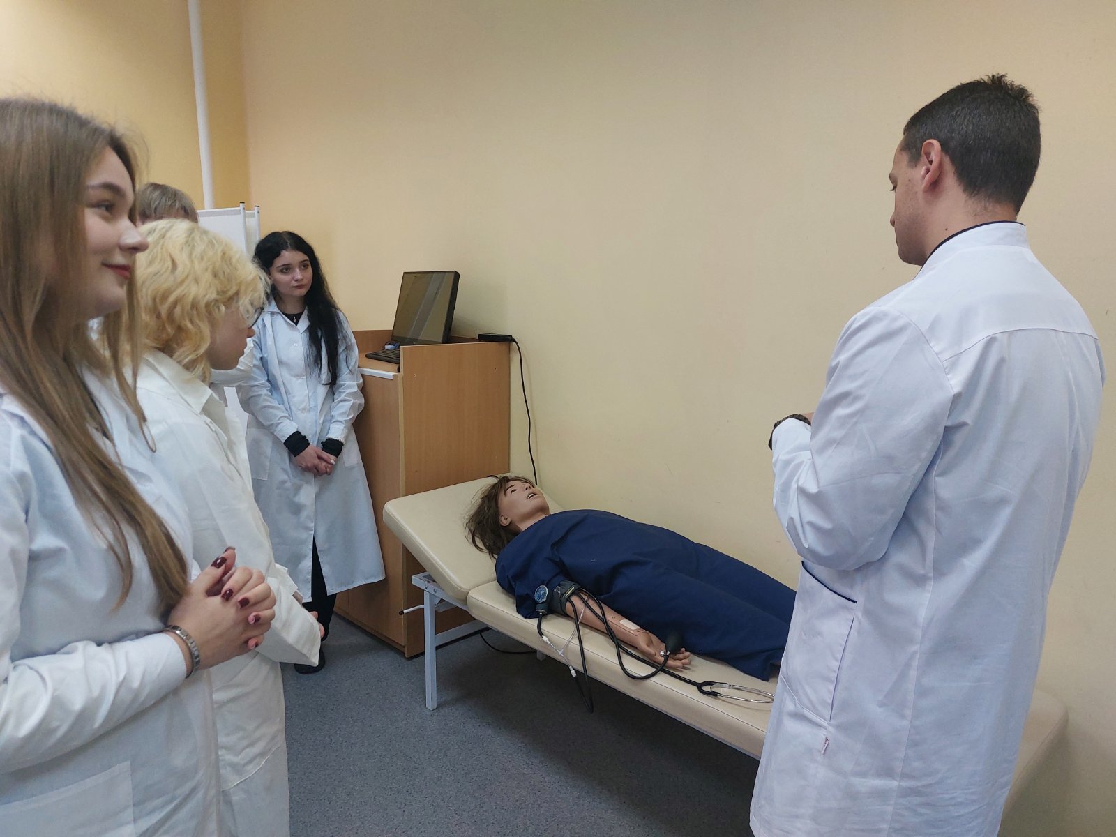 Первым пунктом экскурсионной программы стал симуляционно-аттестационный центр. Здесь благодаря Фёдору Михайловичу Головину ребята познакомились с учебными модулями, где отрабатываются практические навыки будущих врачей. Им рассказали, как симуляционное обучение помогает повысить безопасность и эффективность в реальной практике; о различных типах симуляций, используемых в центре. У учащихся была уникальная возможность поработать на некоторых тренажёрах.