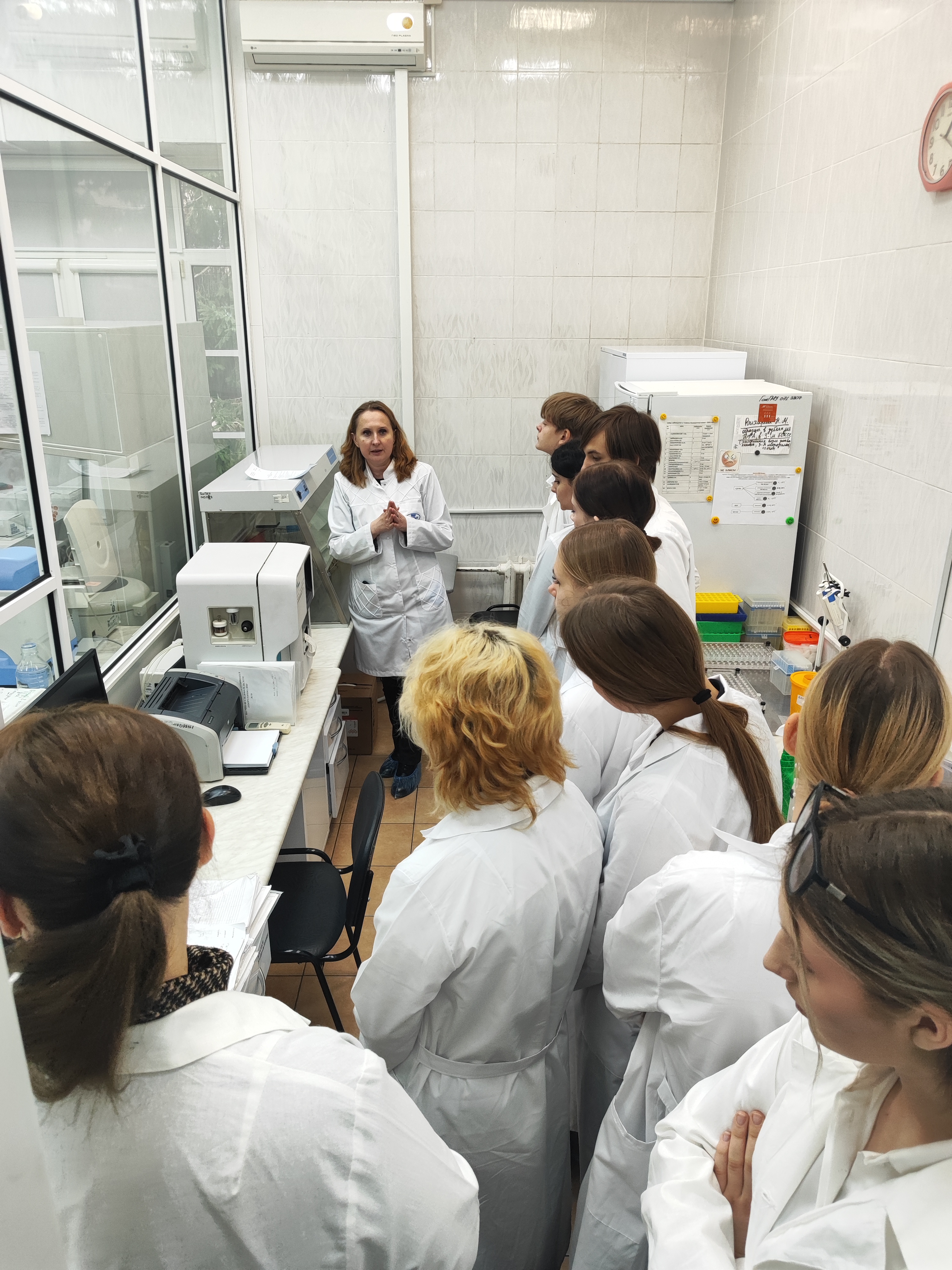 Последним пунктом этого дня стало посещение научно-исследовательской лаборатории, где речицких ребят встретила заведующая НИЛ Ольга Викторовна Осипкина, которая рассказала об истории создания этого структурного подразделения; об основных методах, которые используются при проведении исследований; о приоритетных направлениях научной деятельности. Также был проведён подробный инструктаж по технике безопасности. Экскурсию по научно-исследовательским боксам продолжили старшие научные сотрудники Александр Сергеевич Шафорост и Алексей Александрович Зятьков, которые познакомили ребят с методом молекулярной генетики, с проектом по изучению последствий ковида.