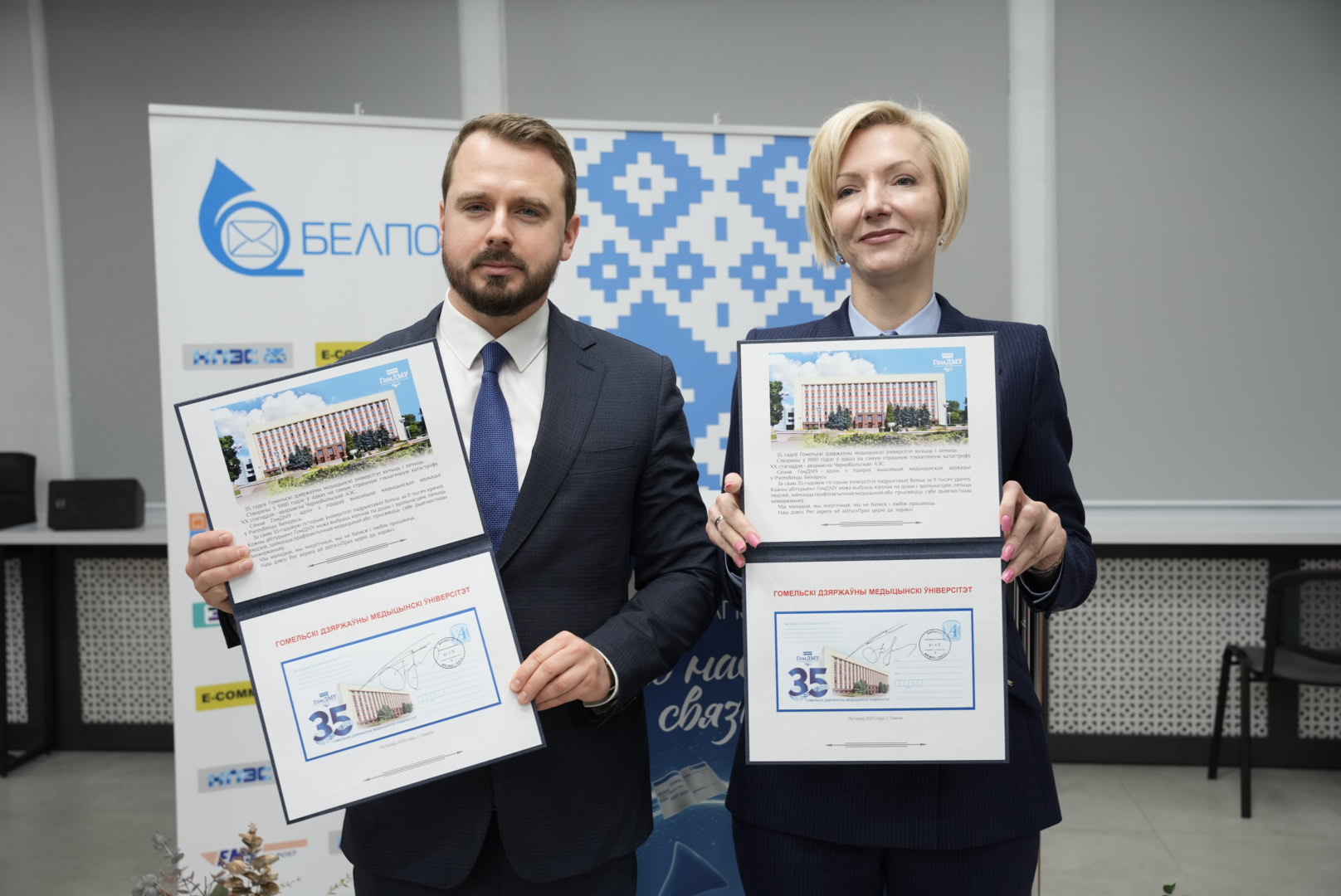 В церемонии официального гашения почтового конверта «35 лет Гомельскому государственному медицинскому университету» приняли участие ректор Гомельского государственного медицинского университета доктор медицинских наук, профессор Игорь Олегович Стома, директор Гомельского филиала Республиканского унитарного предприятия почтовой связи «Белпочта» Галина Анатольевна Терещенко: