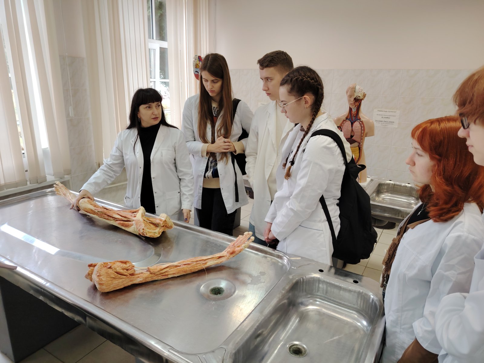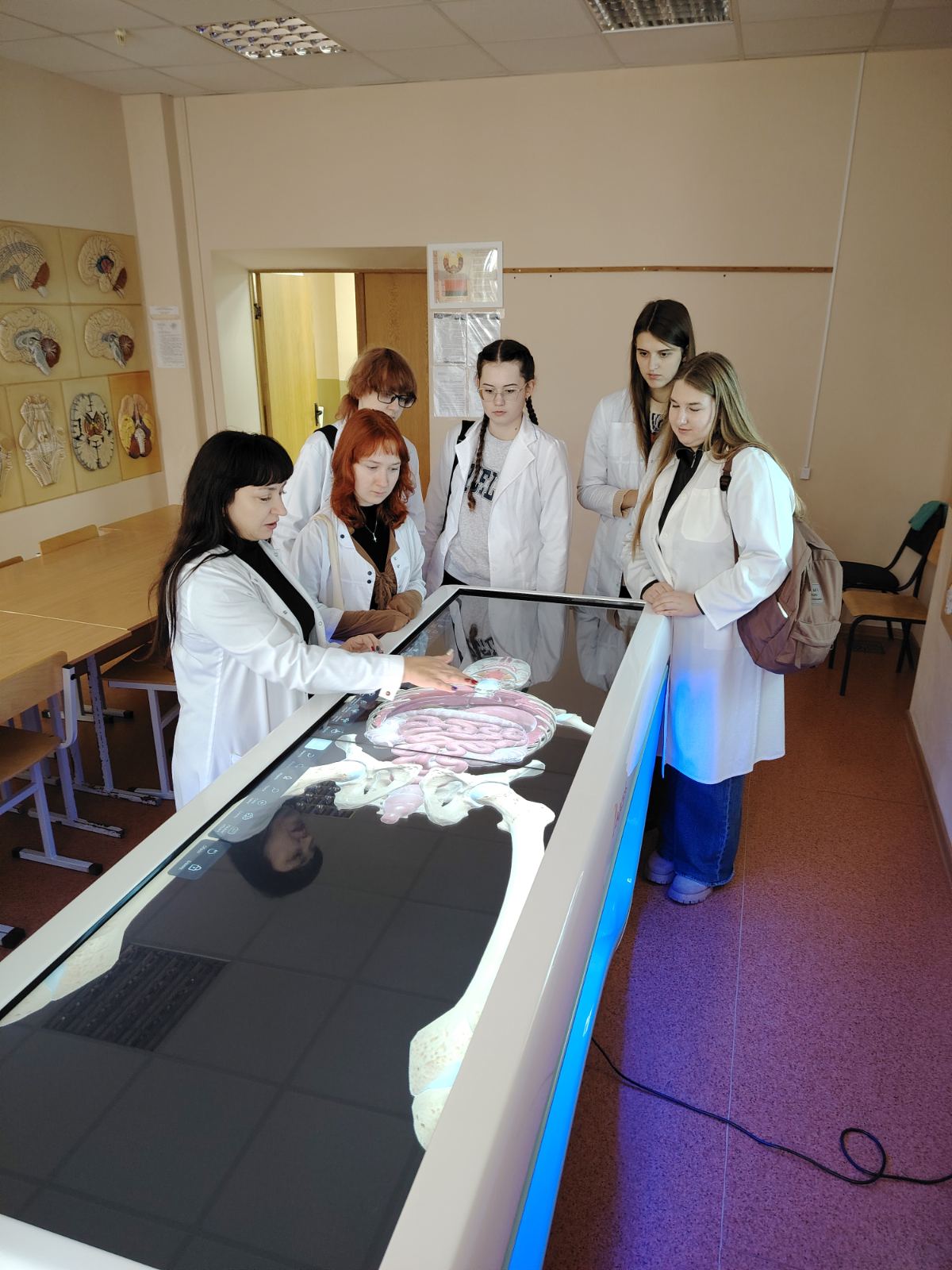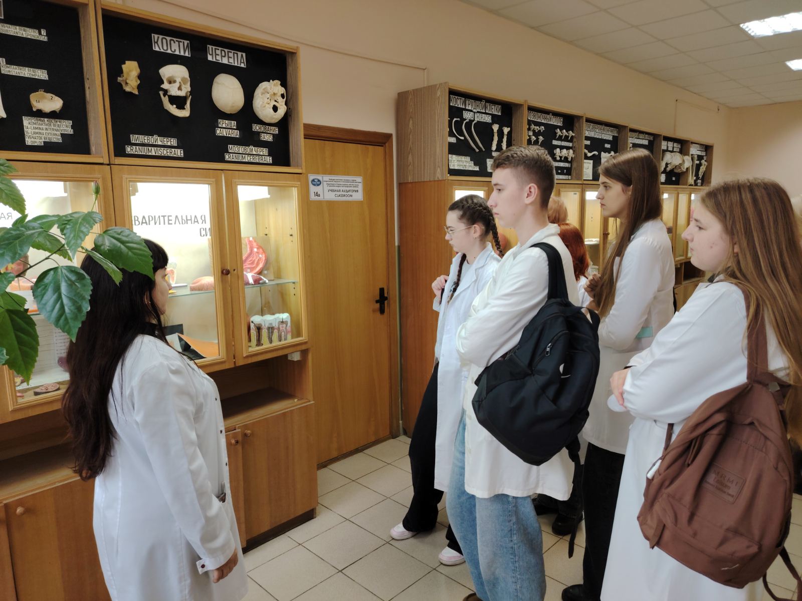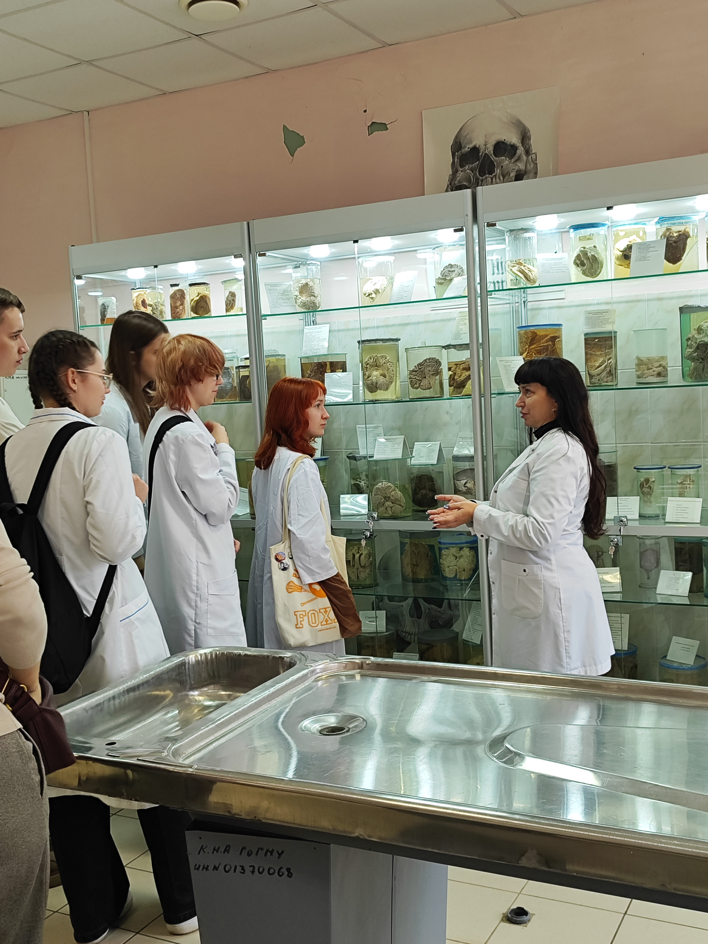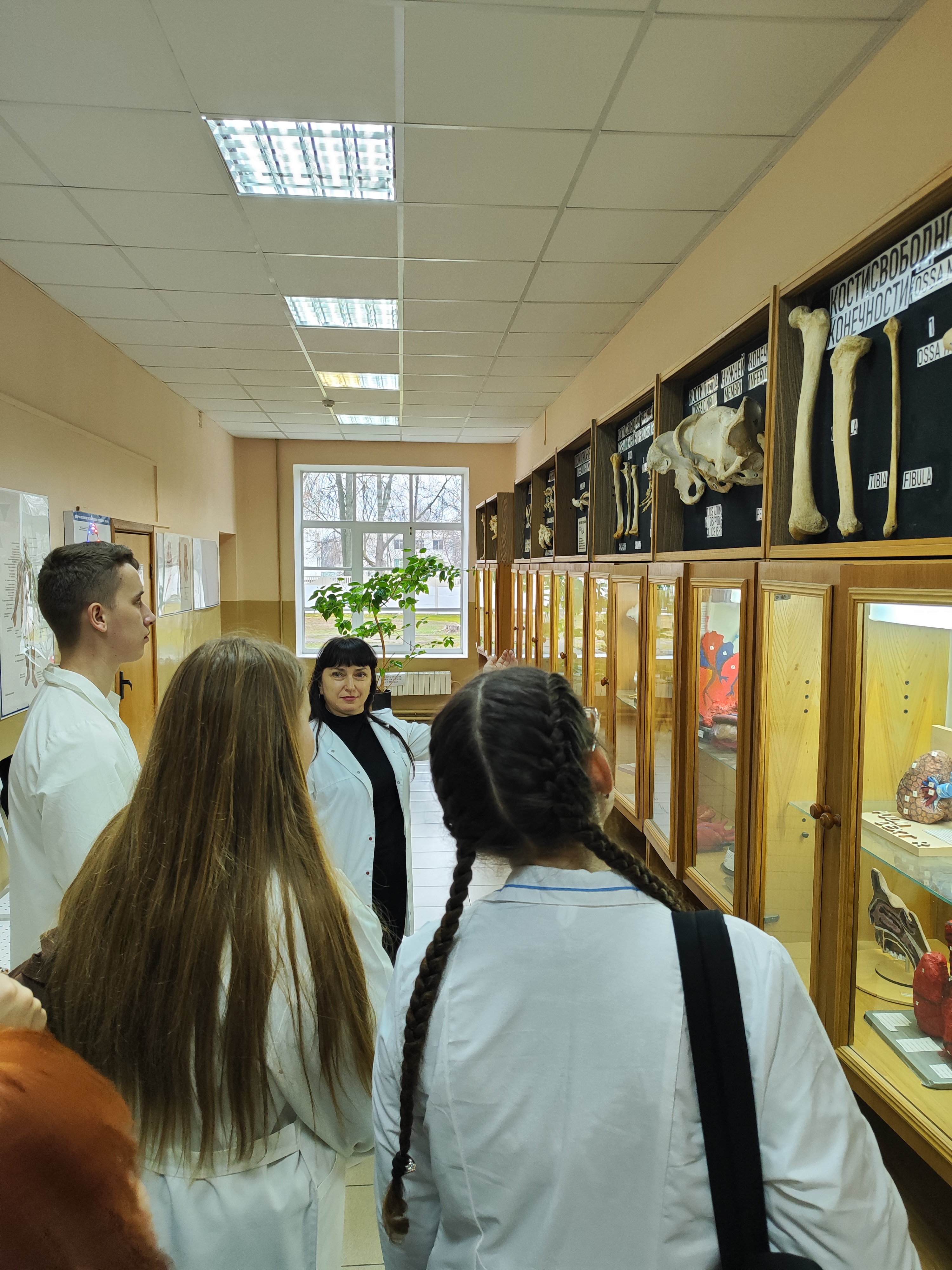 Далее была организована экскурсия в анатомический музей при кафедре анатомии человека с курсом оперативной хирургии и топографической анатомии, которую провела заместитель декана факультета иностранных студентов по идеологической и воспитательной работе Елена Владимировна Ранкович. Ребята увидели муляжи внутренних органов; узнали, как работает организм человека; поговорили о строении сердца, лёгких, мозга и других важных органов; посетили занятие студентов второго курса; познакомились с уникальным по своим функциям столом Пирогова. Елена Владимировна подчеркнула важность анатомии в изучении медицины, объяснила, как строится работа врача и какую роль играет знание человеческого тела.