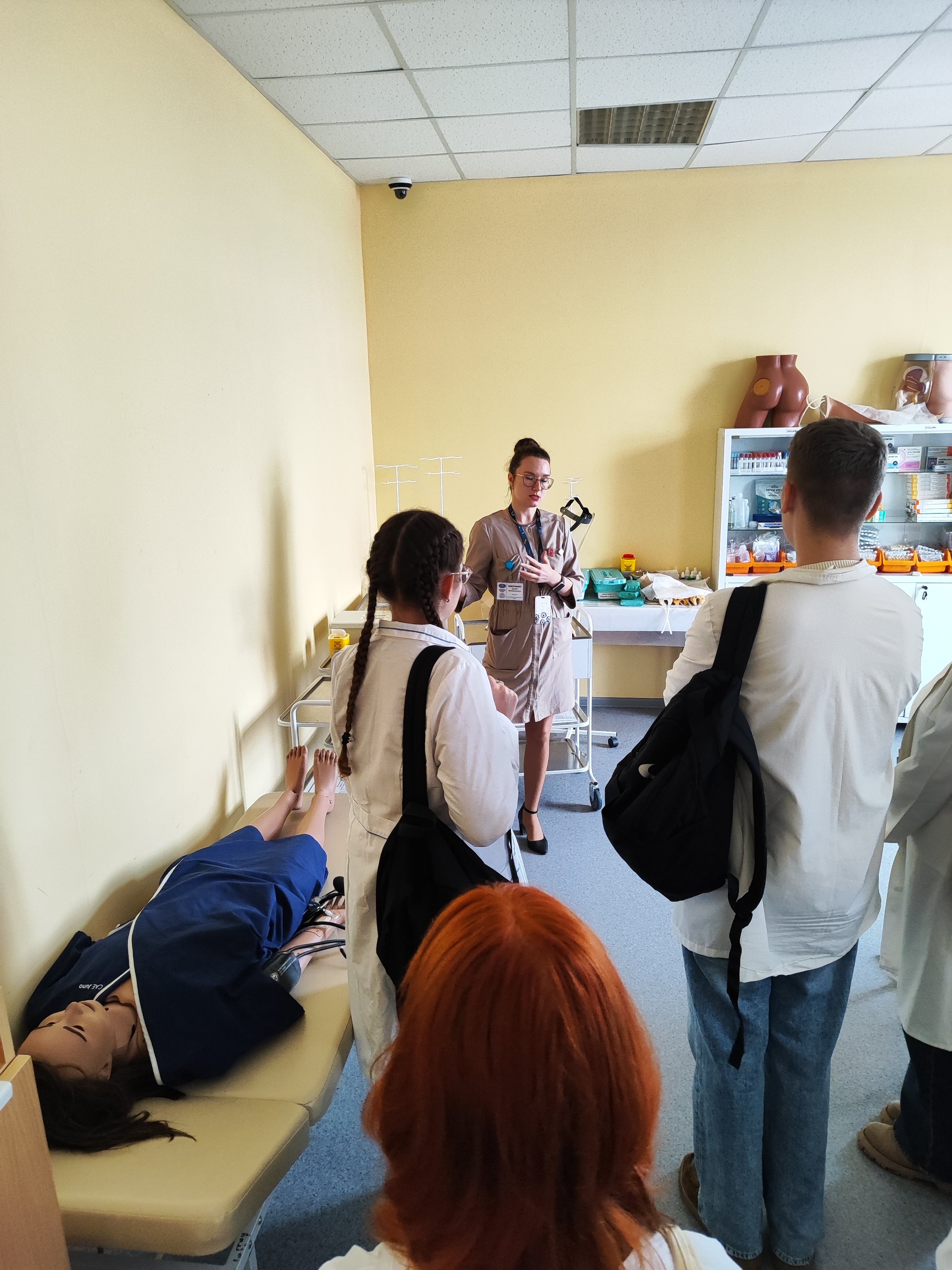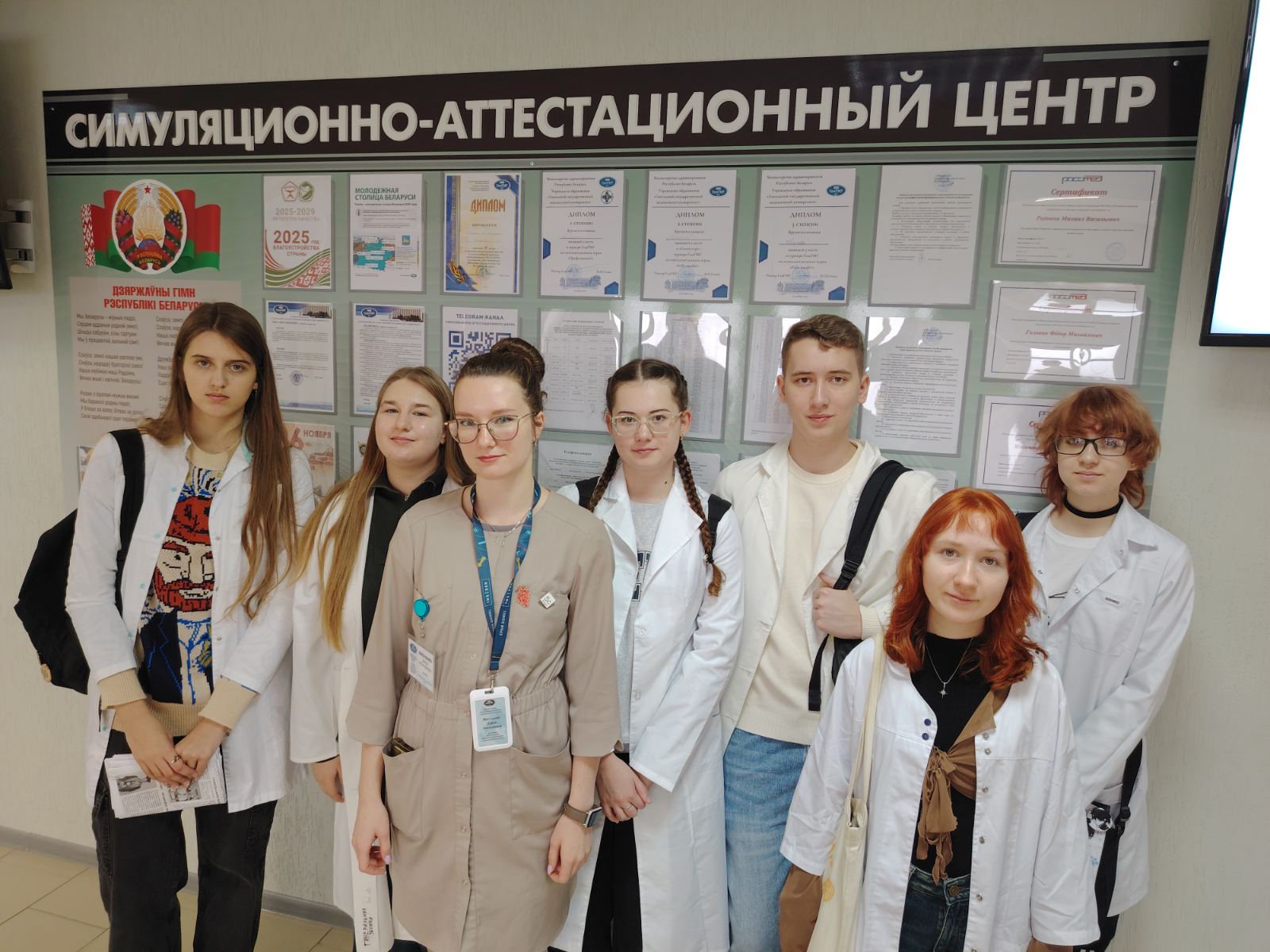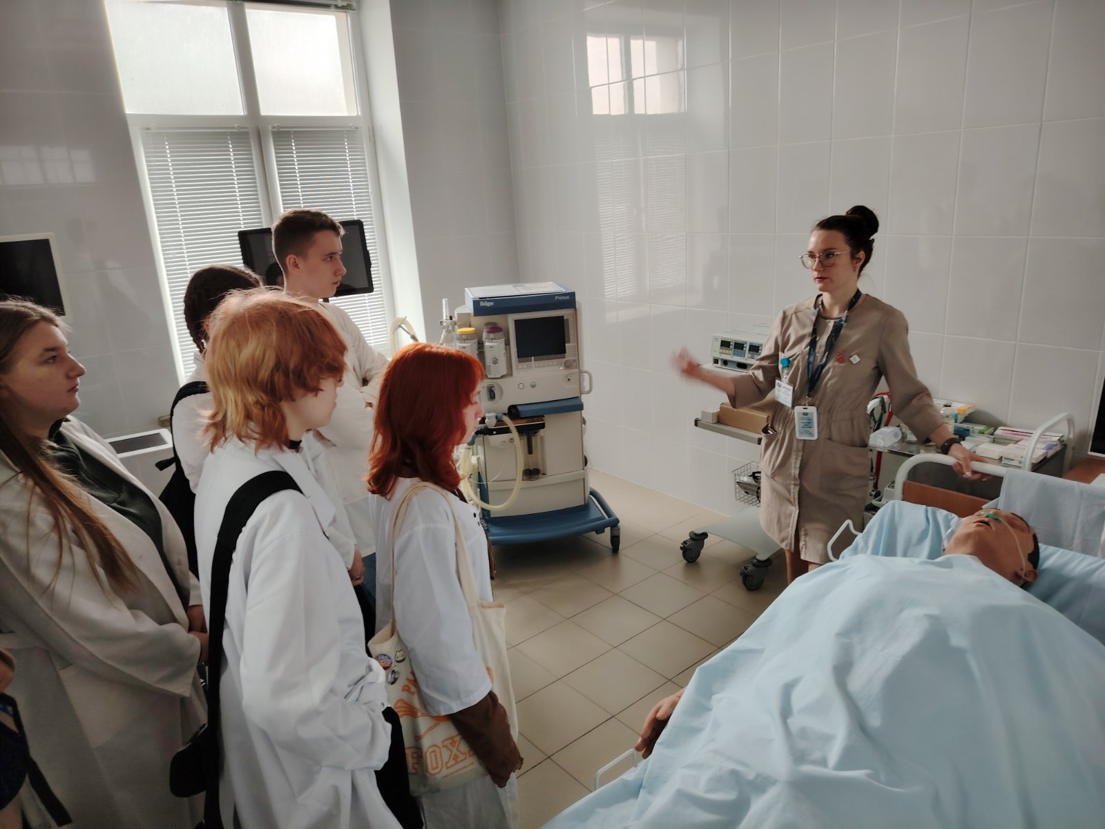 Первым пунктом экскурсионной программы стал симуляционно-аттестационный центр. Здесь благодаря ассистенту Дарье Леонидовне Мисоченко ребята познакомились с учебными модулями, где отрабатываются практические навыки будущих врачей. Им рассказали, как сдаётся ОСКЭ, как прорабатывают методику «Стандартизированный пациент». У учащихся была уникальная возможность увидеть работу и функциональные особенности тренажёров.