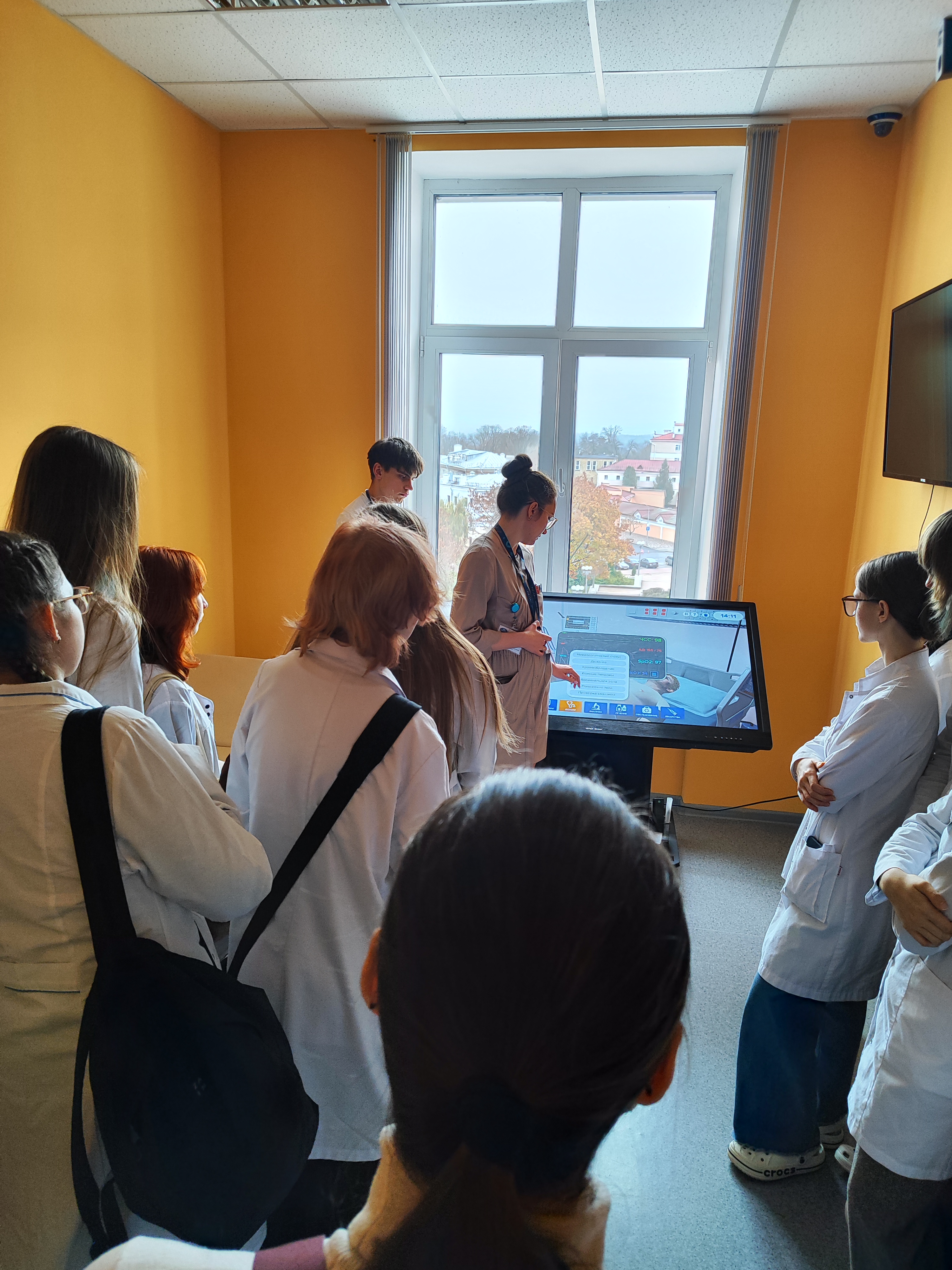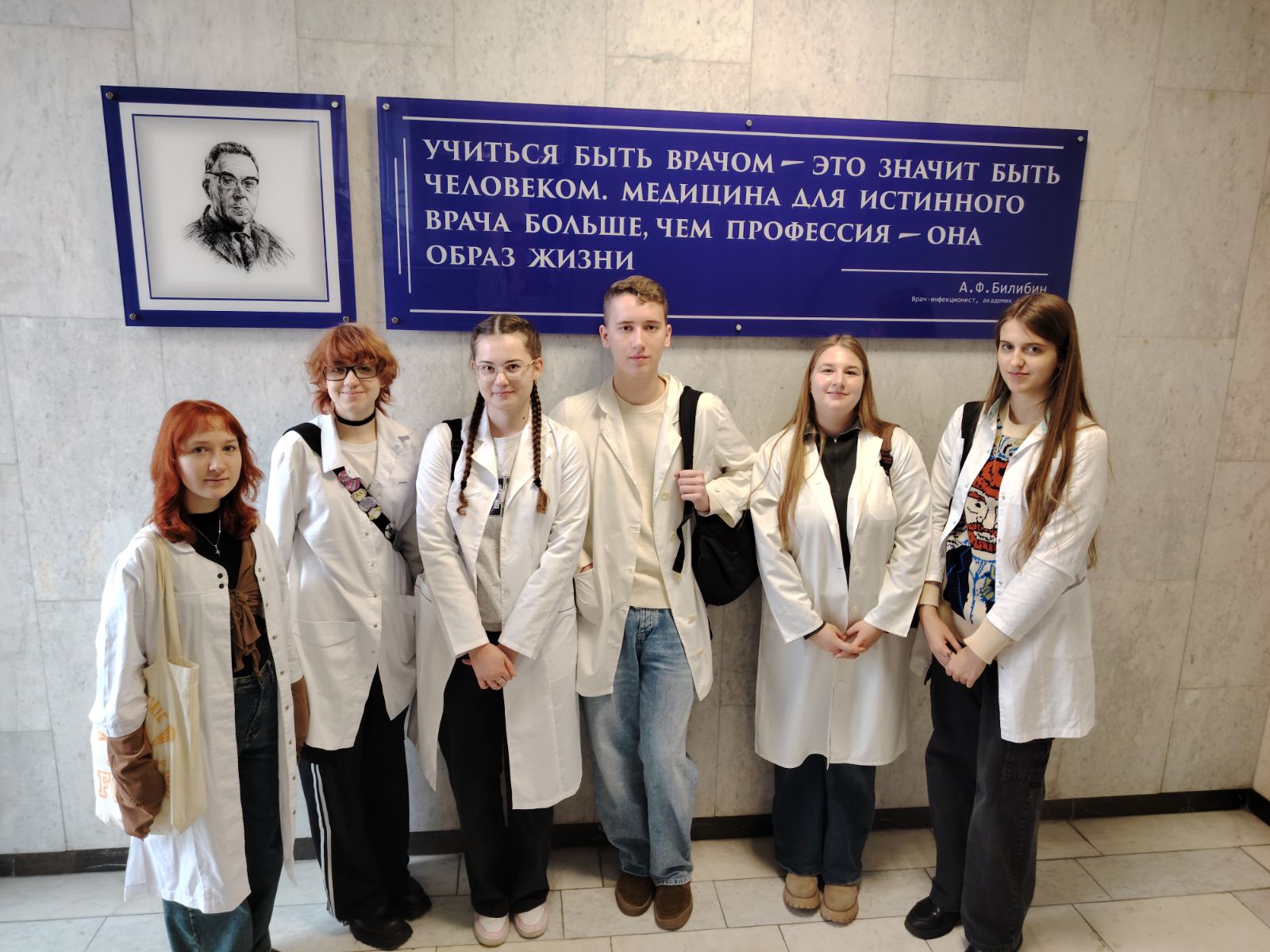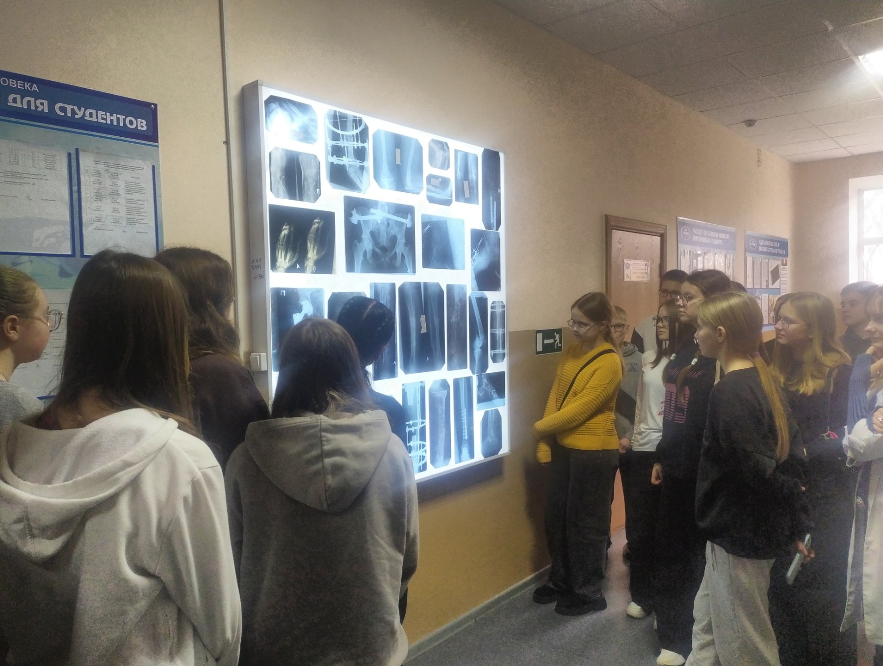 Первым пунктом экскурсионной программы стал симуляционно-аттестационный центр. Здесь благодаря ассистенту Дарье Леонидовне Мисоченко ребята познакомились с учебными модулями, где отрабатываются практические навыки будущих врачей. Им рассказали, как сдаётся ОСКЭ, как прорабатывают методику «Стандартизированный пациент». У учащихся была уникальная возможность увидеть работу и функциональные особенности тренажёров.