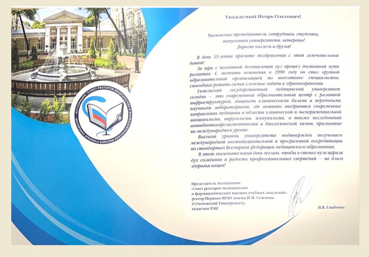 Сердечно поздравляю с 35-летием Гомельского медицинского университета Беларуси!