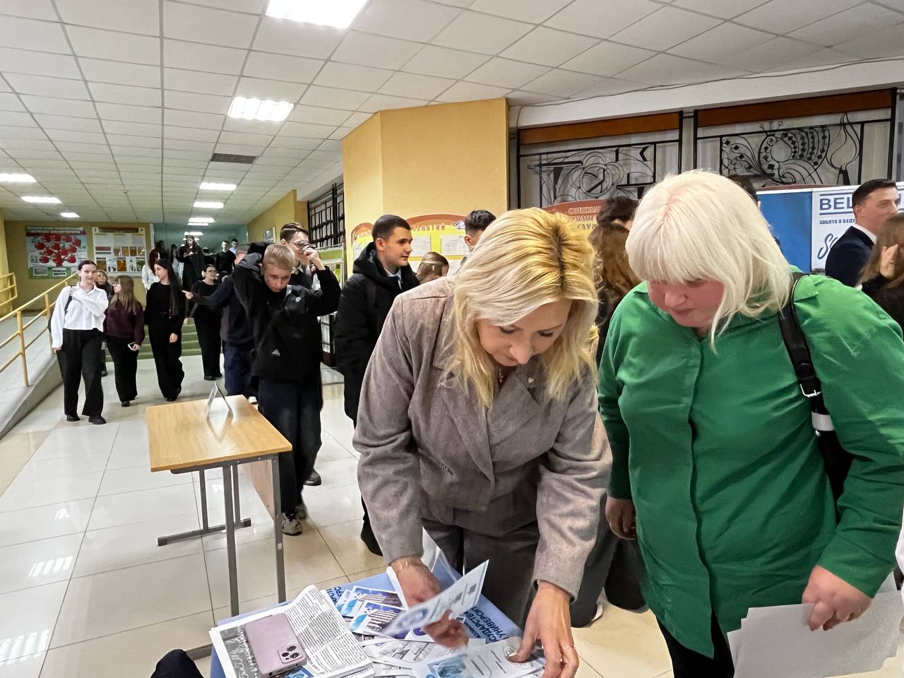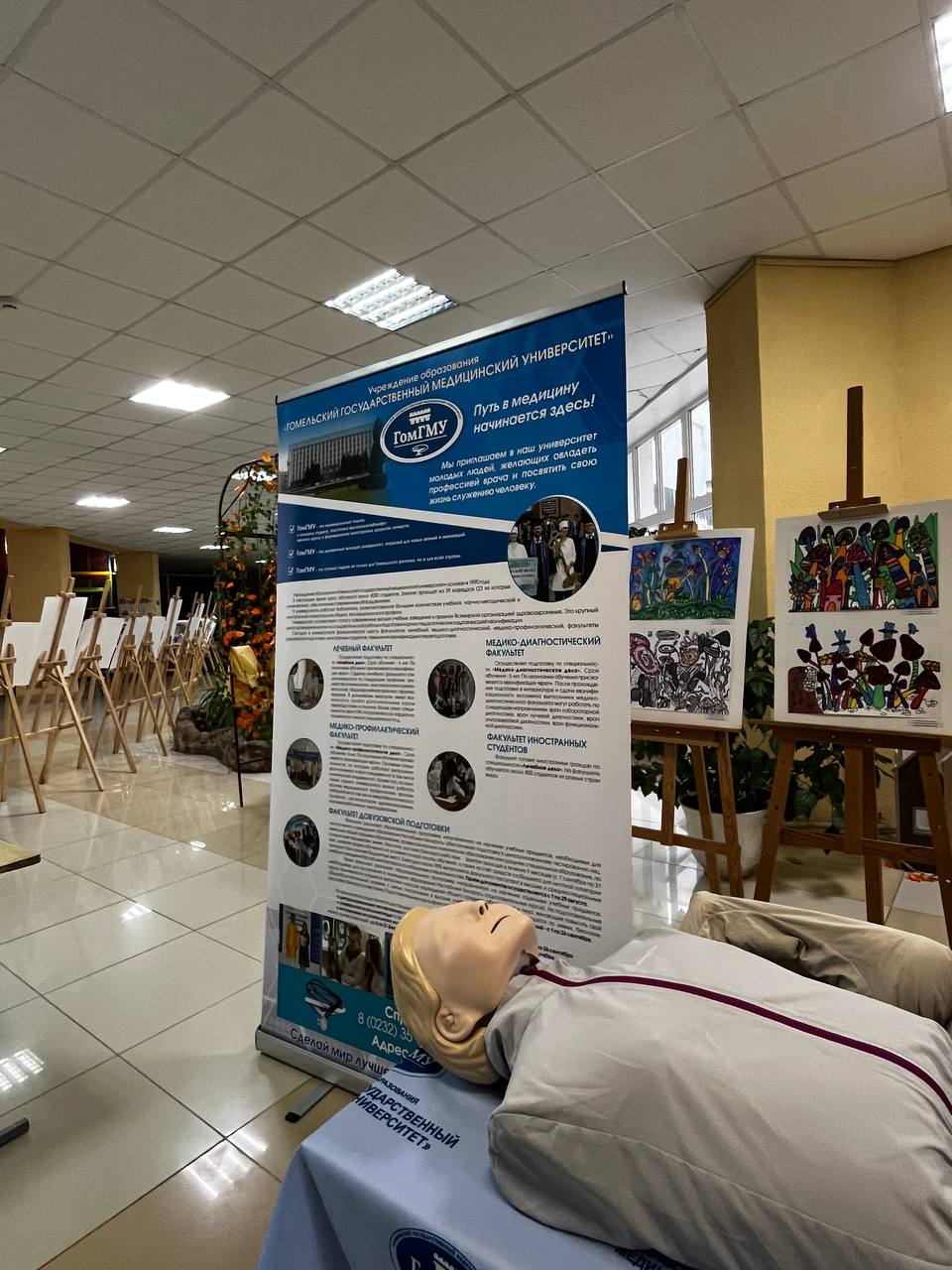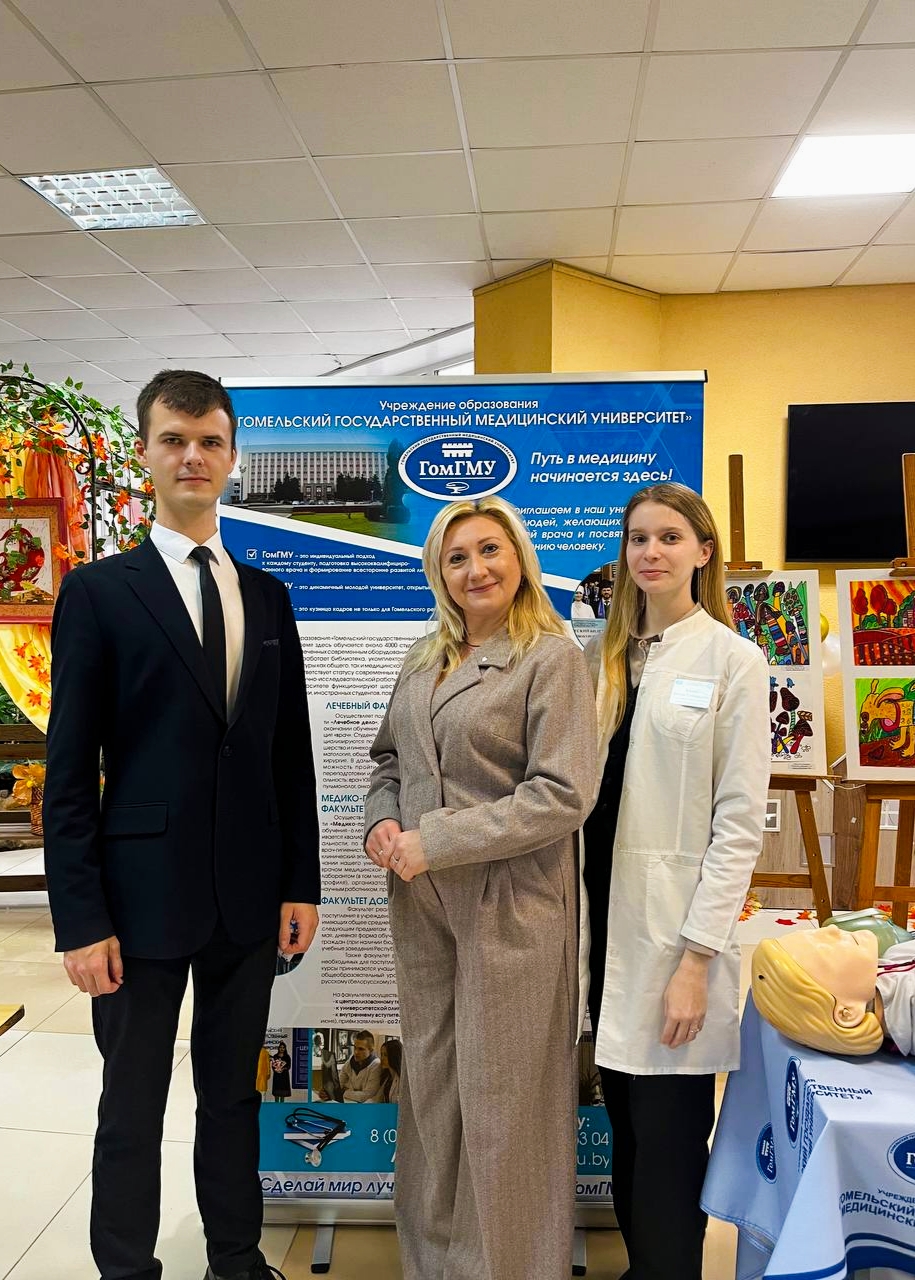 После запланированных на этот день профориентационных выступлений в холле Центра творчества и молодёжи Солигорского района состоялась выставка учреждений образования и предприятий-заказчиков кадров, где свою экспозицию представил и ГомГМУ. Здесь школьники, заинтересовавшиеся профессией врача, могли получить дополнительную информацию по поступлению. Наталья Павловна рассказала о возможности стать студентом-медиком через победу в университетской олимпиаде, регистрация на которую началась уже 14 ноября.