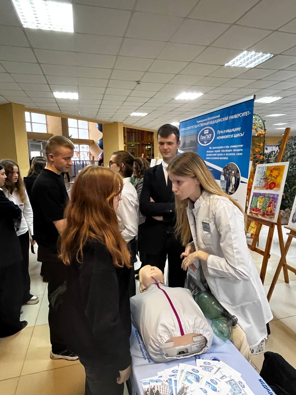 В качестве помощников выступили студенты лечебного факультета Михаил Коновальчик и Полина Ясюченя, которые продемонстрировали мастер-класс по сердечно-лёгочной реанимации. Многие из присутствующих на выставке приняли участие в оказании первой медицинской помощи. Кроме того, Михаил и Полина делились со школьниками своими впечатлениями об учёбе в ГомГМУ.