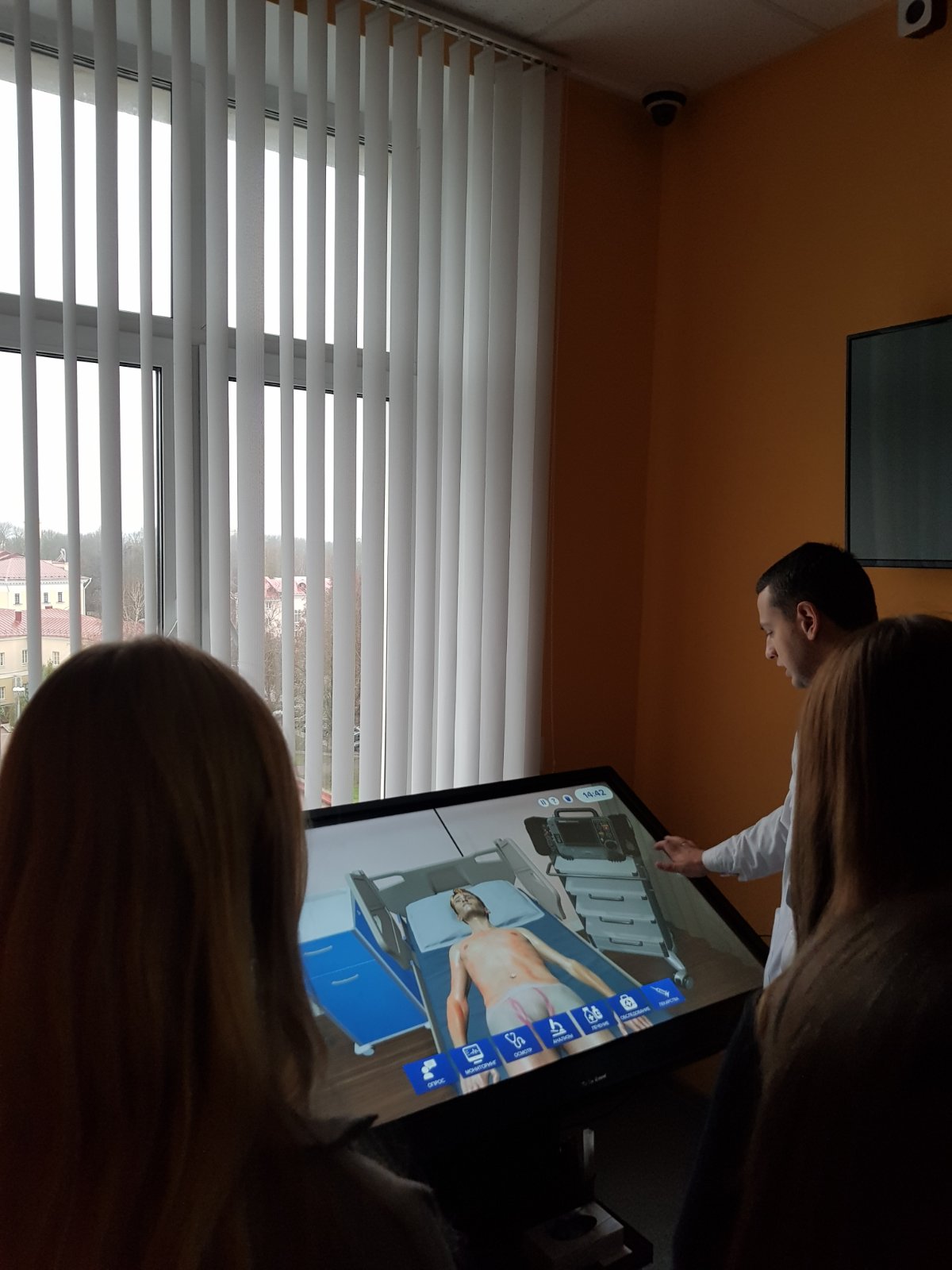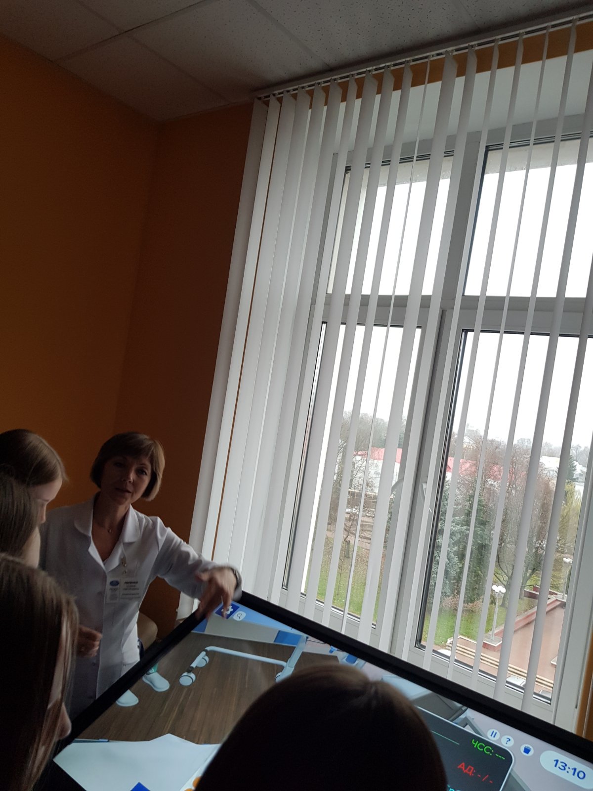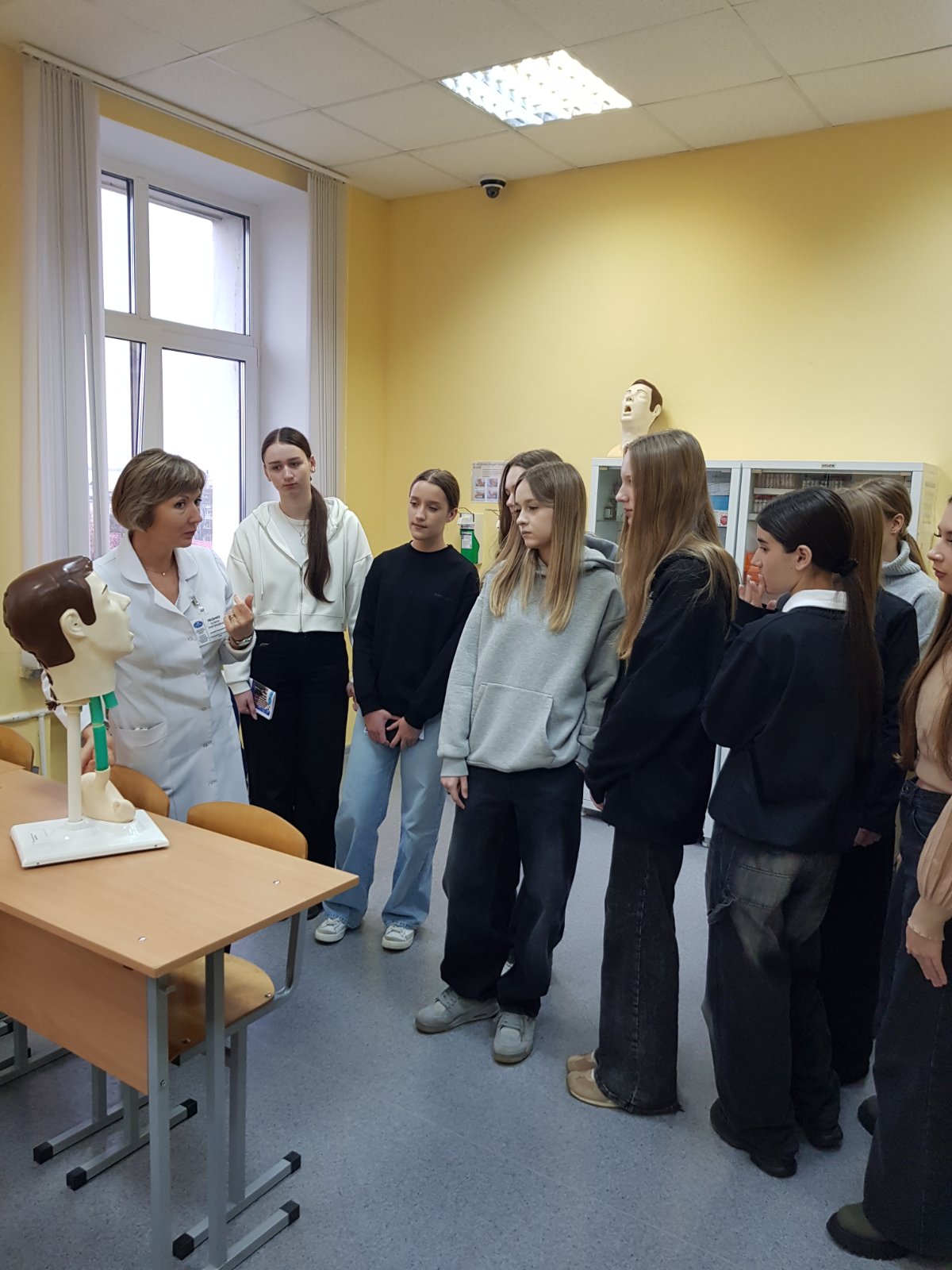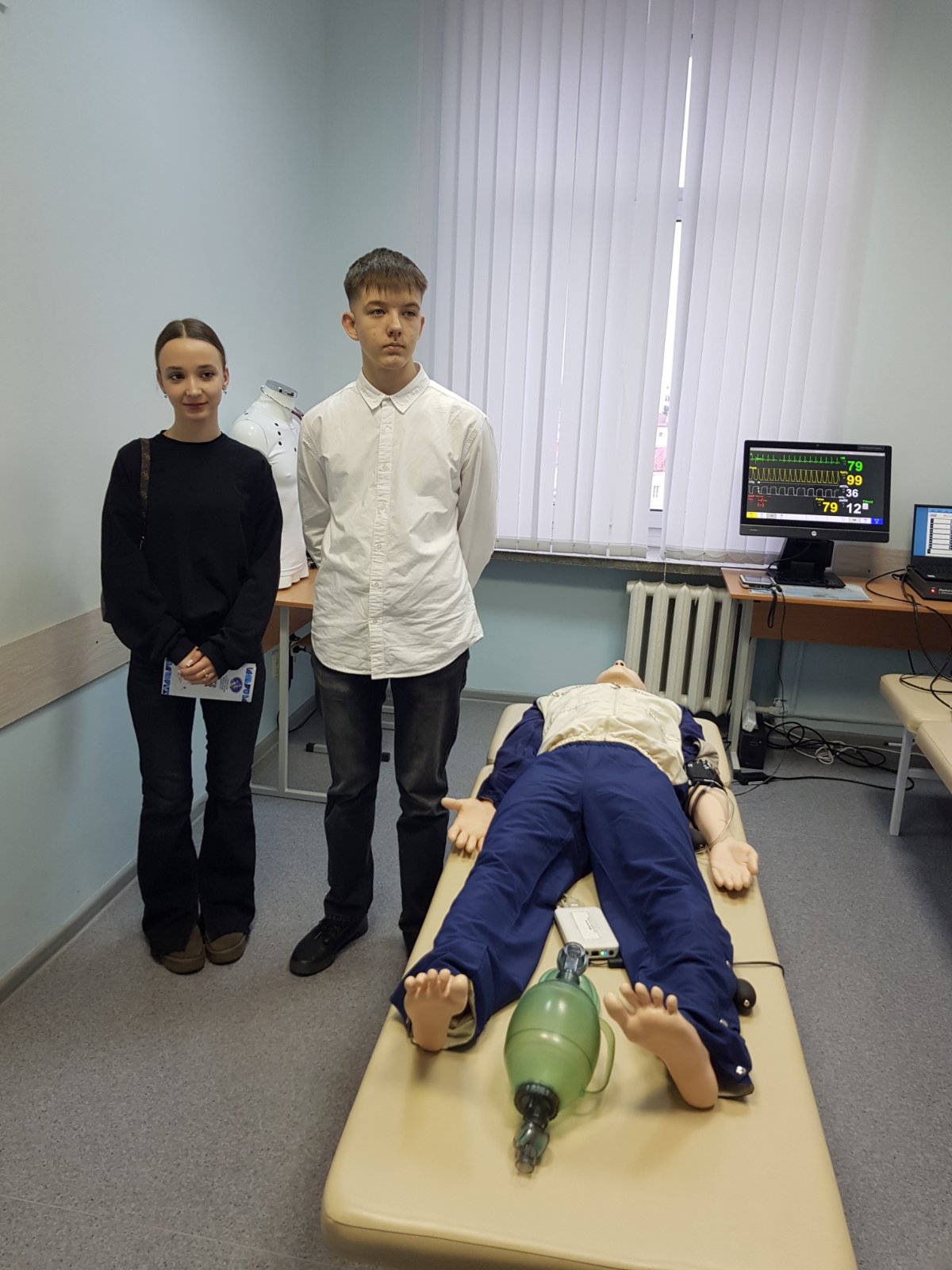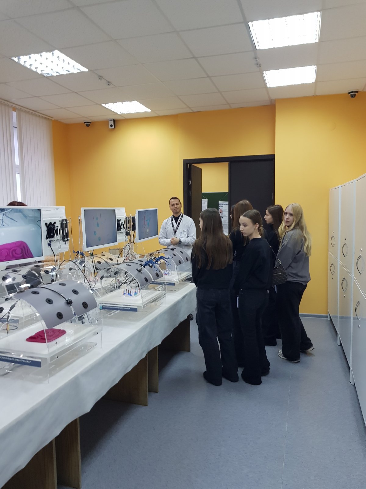 Программа насыщенного дня включала экскурсию в симуляционно-аттестационный центр, которую провели Фёдор Михайлович Головин и Галина Григорьевна Песенко. Ребята познакомились с учебными модулями, где отрабатываются практические навыки будущих врачей. У учащихся была уникальная возможность увидеть возможности и функциональные особенности роботов-манекенов, а также попробовать «спасти» виртуального пациента.