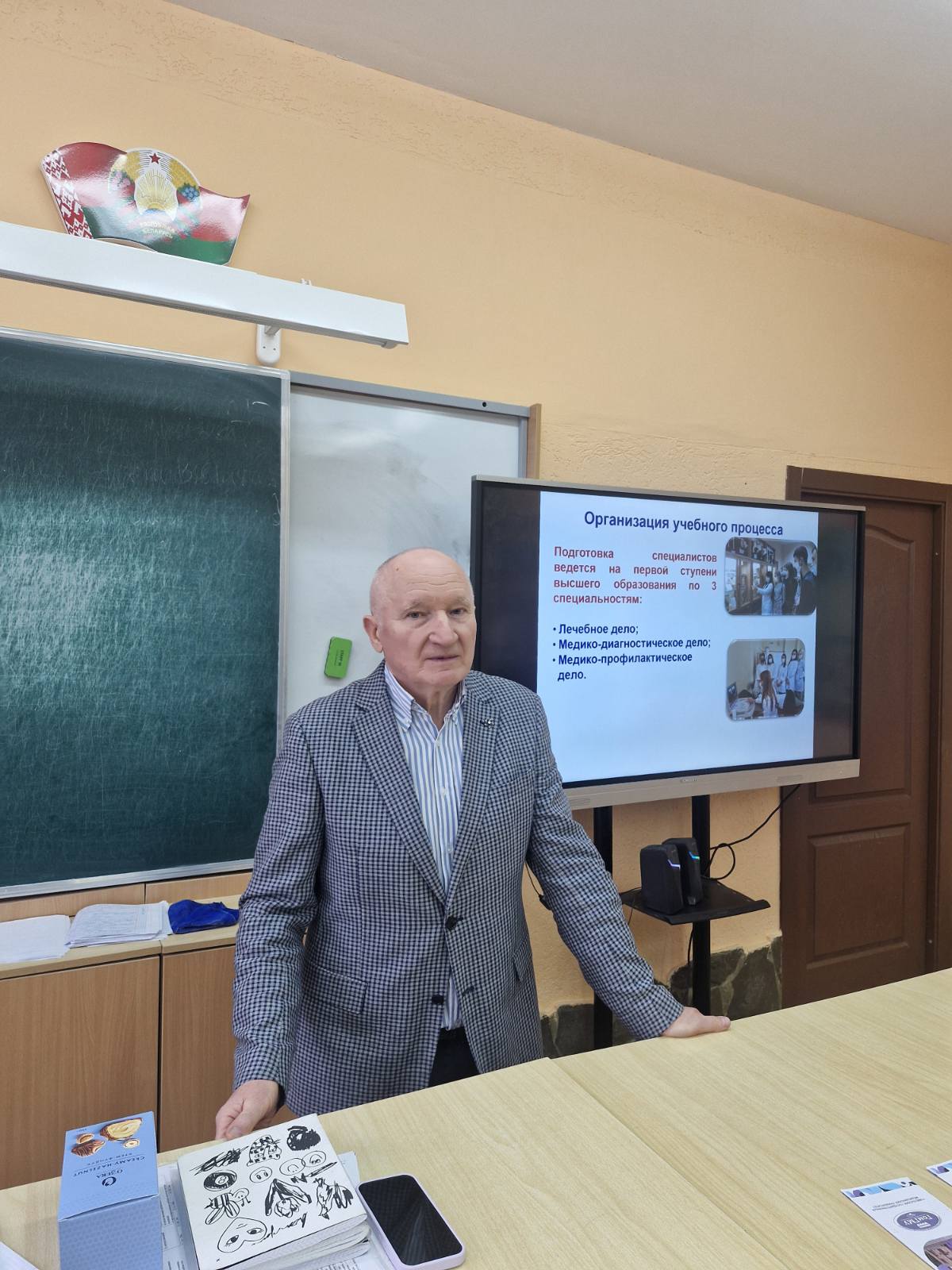 Владимир Николаевич познакомил будущих абитуриентов с особенностями обучения на факультетах, рассказал о научной, культурной и общественной деятельности ГомГМУ, о профессиях медицинского профиля. Также были освещены вопросы поступления в университет. Особое внимание уделялось приёму абитуриентов на условиях целевой подготовки и сдаче внутреннего экзамена по биологии.