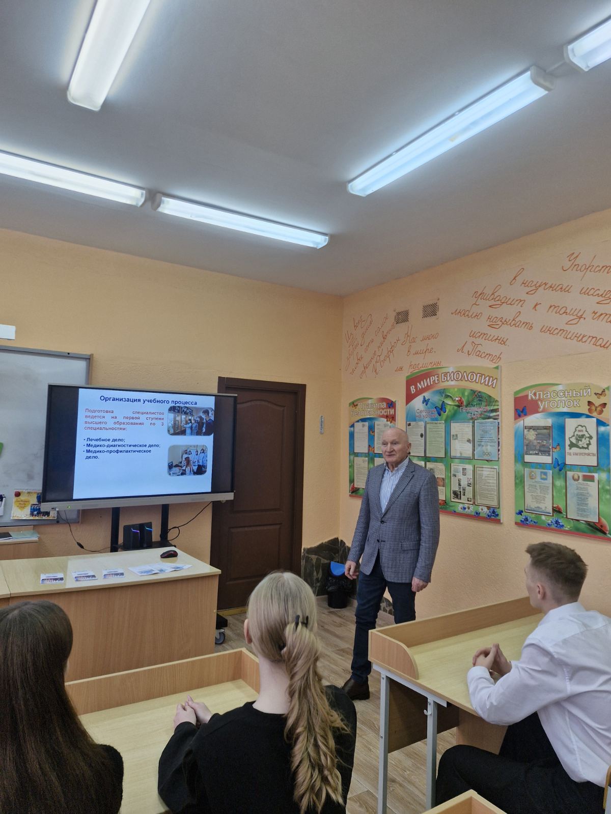 24 ноября в ГУО «Средняя школа №21 г.Гомеля» прошло яркое профориентационное мероприятие с участием заведующего кафедрой экологической и профилактической медицины Владимира Николаевича Бортновского, который рассказал учащимся о том, каким был его профессиональный путь. Ребята с большим интересом слушали откровенные рассказы Владимира Николаевича и задавали большое количество вопросов.