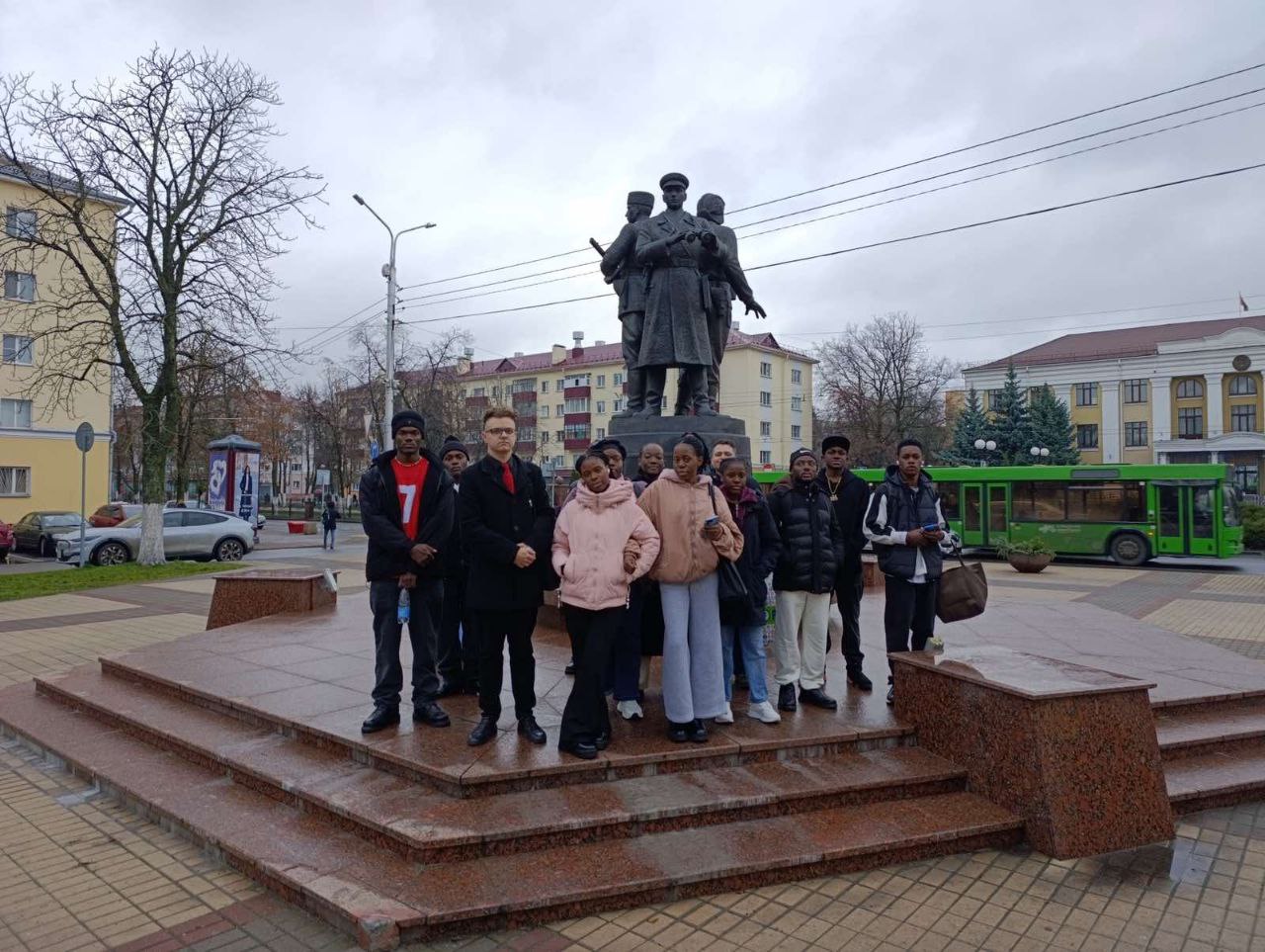 Памятник братьям Лизюковым. В сквере имени героев студенты узнали о подвигах трех братьев-гомельчан: Александра, Петра и Евгения Лизюковых, которые стали символом мужества и самопожертвования.