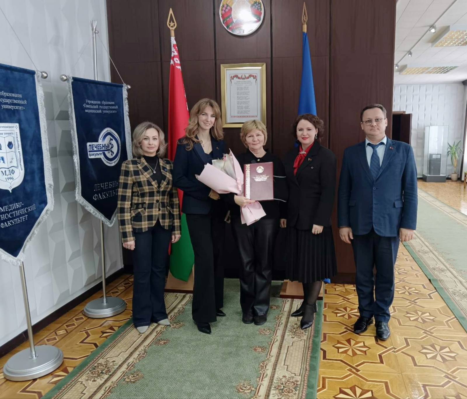 Ректор Гомельского государственного медицинского университета Ирина Вячеславовна Назаренко от имени коллектива университета поздравила с юбилеем заведующего кафедрой лучевой диагностики с курсом ФПКиП Наталию Борисовну Кривелевич.