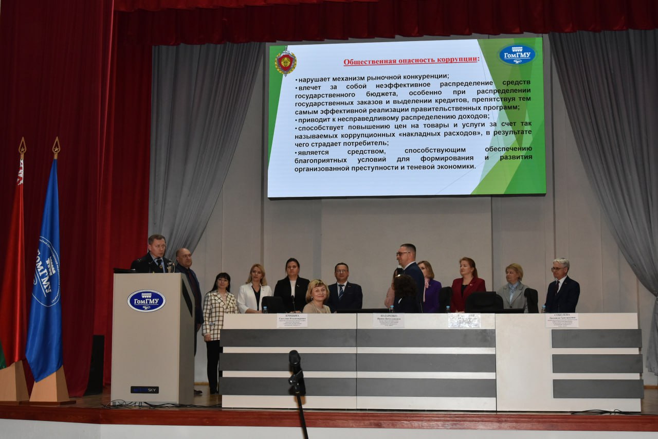 17 марта состоялась встреча работников университета с начальником управления Государственного комитета судебных экспертиз Республики Беларусь по Гомельской области Павлом Владимировичем Бакшанским. Мероприятие было посвящено одной из наиболее актуальных тем современности – профилактике коррупционных нарушений. Открывая встречу, докладчик подчеркнул важность обсуждаемой темы, процитировав слова из доклада Президента Республики Беларусь А.Г.Лукашенко на пятом Всебелорусском собрании: «Государство для народа, справедливость, защита простого человека – это то, на чем стояла и стоять будет белорусская государственность».