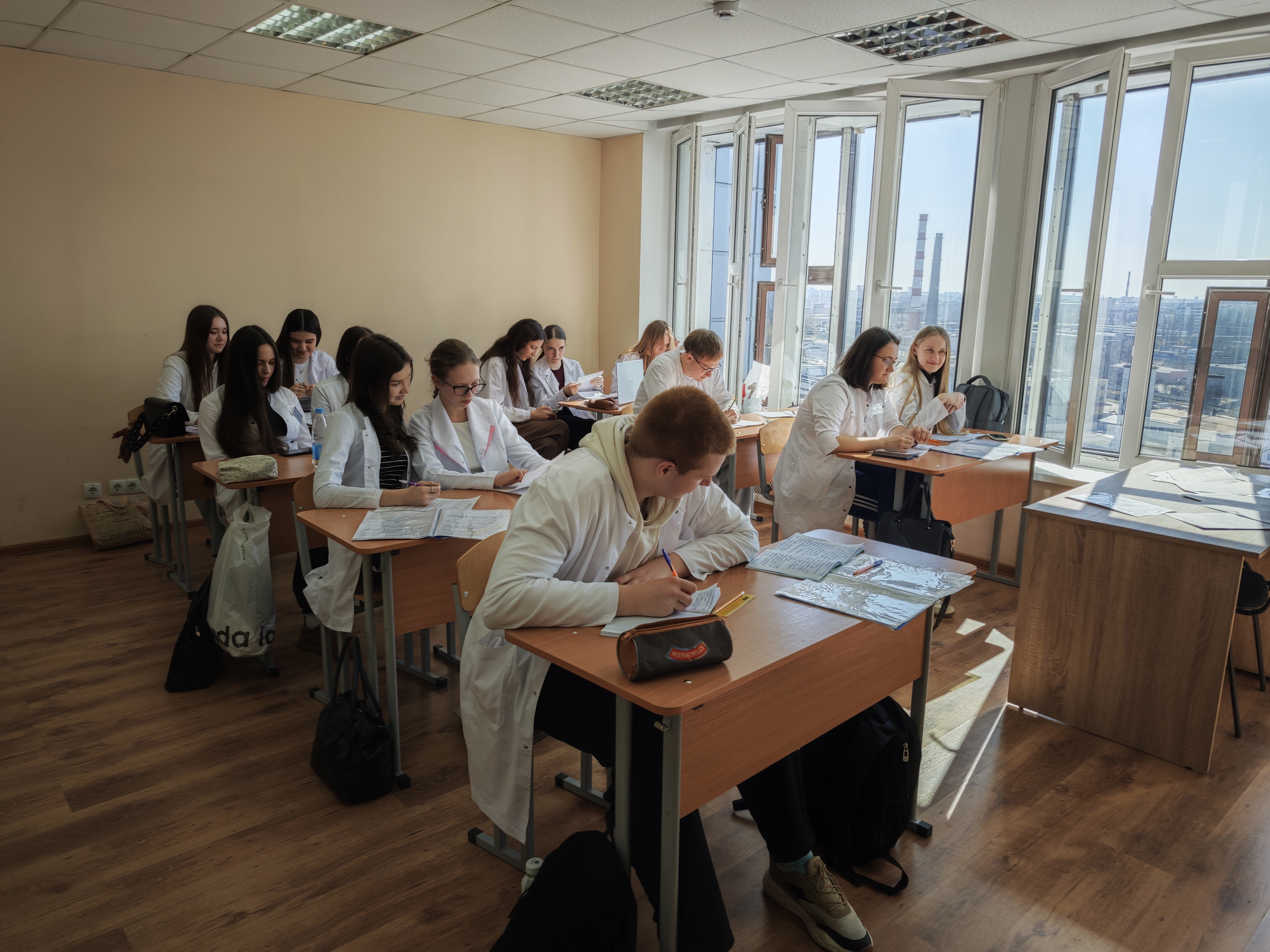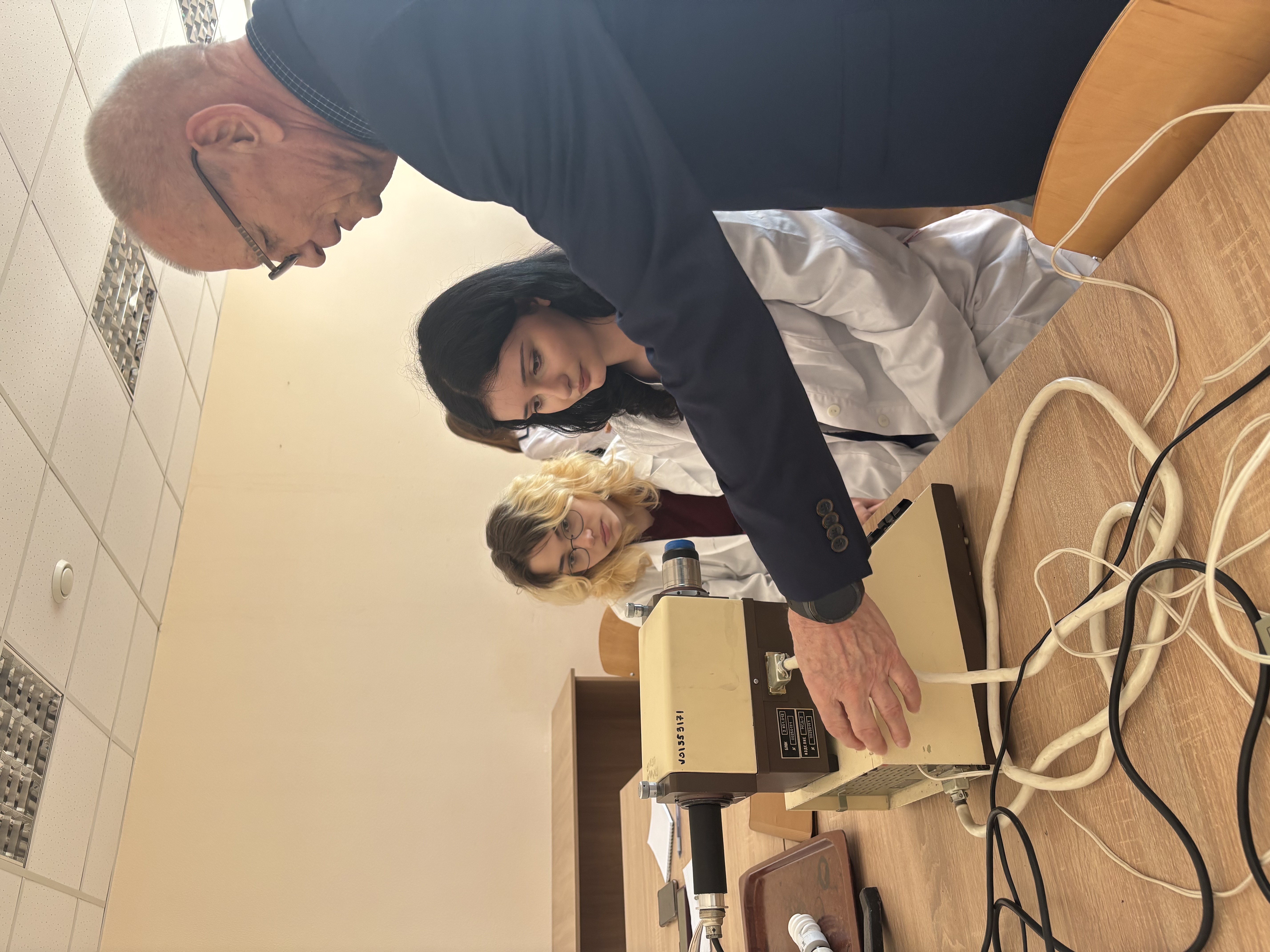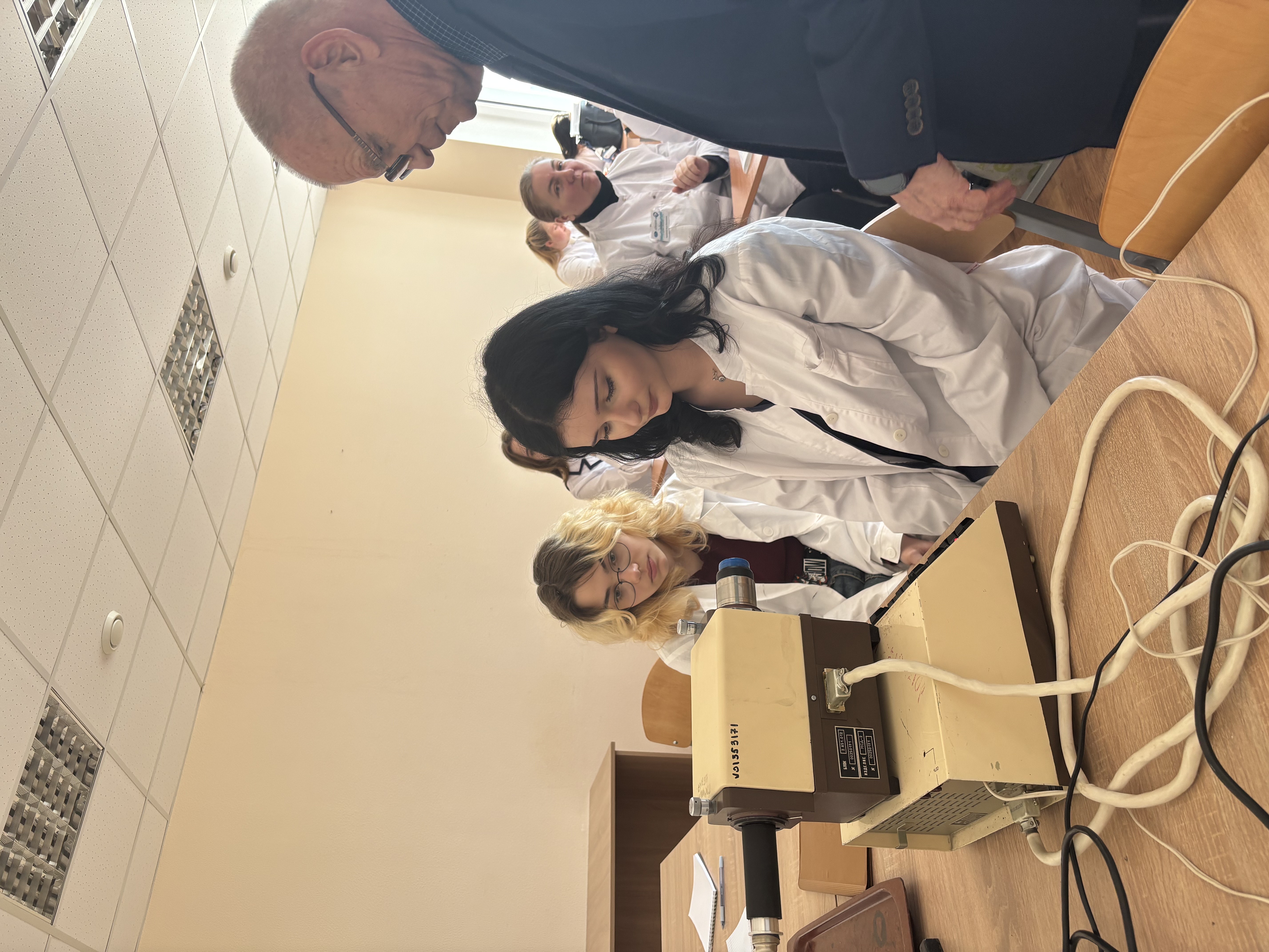 Вместе со студентами лечебного факультета (группа Л-119) они побывали на лабораторном занятии по теме ««Градуировка спектроскопа по спектру неоновой лампы». Целью занятия было наблюдение спектров испускания различных источников света с помощью монохроматора, определение спектральных линий в спектре излучения одноатомных газов.