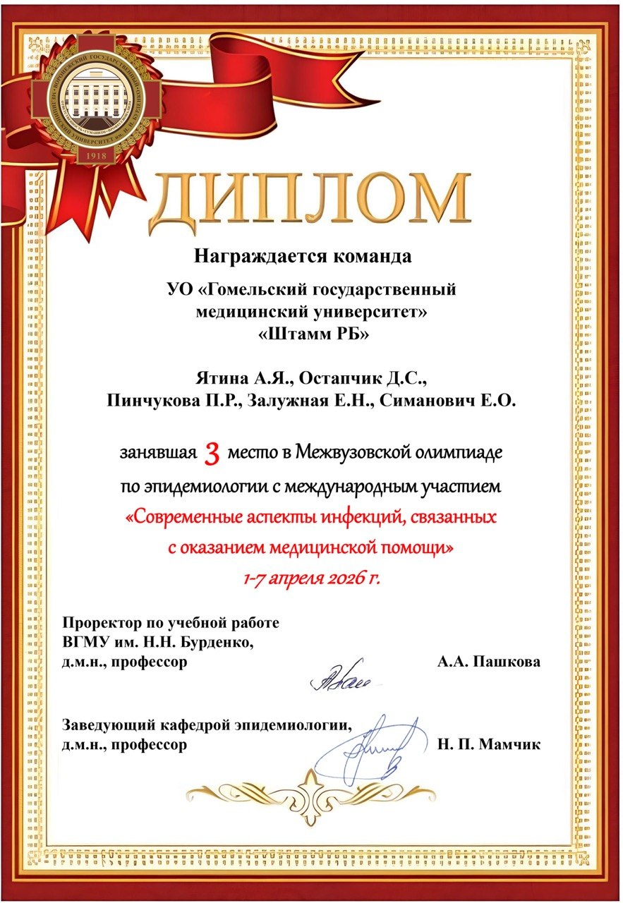 Занять третье место в таком представительном соревновании – это не только почетный результат, но и мощный стимул дальше углубляться в вопросы эпидемиологии и инфекционного контроля в организациях здравоохранения. Уверена, что полученные знания и опыт обязательно помогут всей нашей команде в дальнейшей учебе, практической и научной деятельности. Хотелось бы выразить благодарность организаторам олимпиады за профессиональное проведение, актуальность заданий и возможность обмена опытом. Отдельная благодарность научному руководителю команды и заведующему кафедрой эпидемиологии и доказательной медицины Людмиле Павловне Мамчиц за качественную подготовку и поддержку, а также декану медико-профилактического факультета Надежде Александровне Бонда.