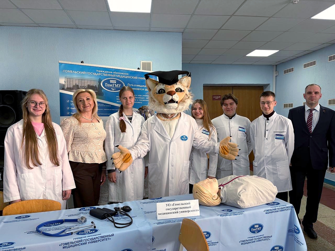 Наш университет, который представили декан факультета довузовской подготовки Н.П.Тимошенко и доцент кафедры общей и биоорганической химии А.И.Макаренко, подготовил интерактивную программу, которая вызвала живой интерес у подрастающего поколения. ГомГМУ превратил профориентационное мероприятие в настоящий праздник здоровья и открытий. Школьники и учителя не просто слушали о том, как учиться на врача, они попробовали профессию «на вкус»: на мастер-классе по сердечно-лёгочной реанимации ребята с помощью наших опытных студентов почувствовали себя теми, кто спасает человеческие жизни. Также наши студенты измерили десяткам гостей артериальное давление и уровень сахара в крови. Это был своеобразный пост диагностики. А какой восторг вызвала наша ростовая кукла Рысь – символ ГомГМУ! С этим милым созданием сфотографировался абсолютно каждый – от самого молодого участника мероприятия до руководителей этого проекта.
