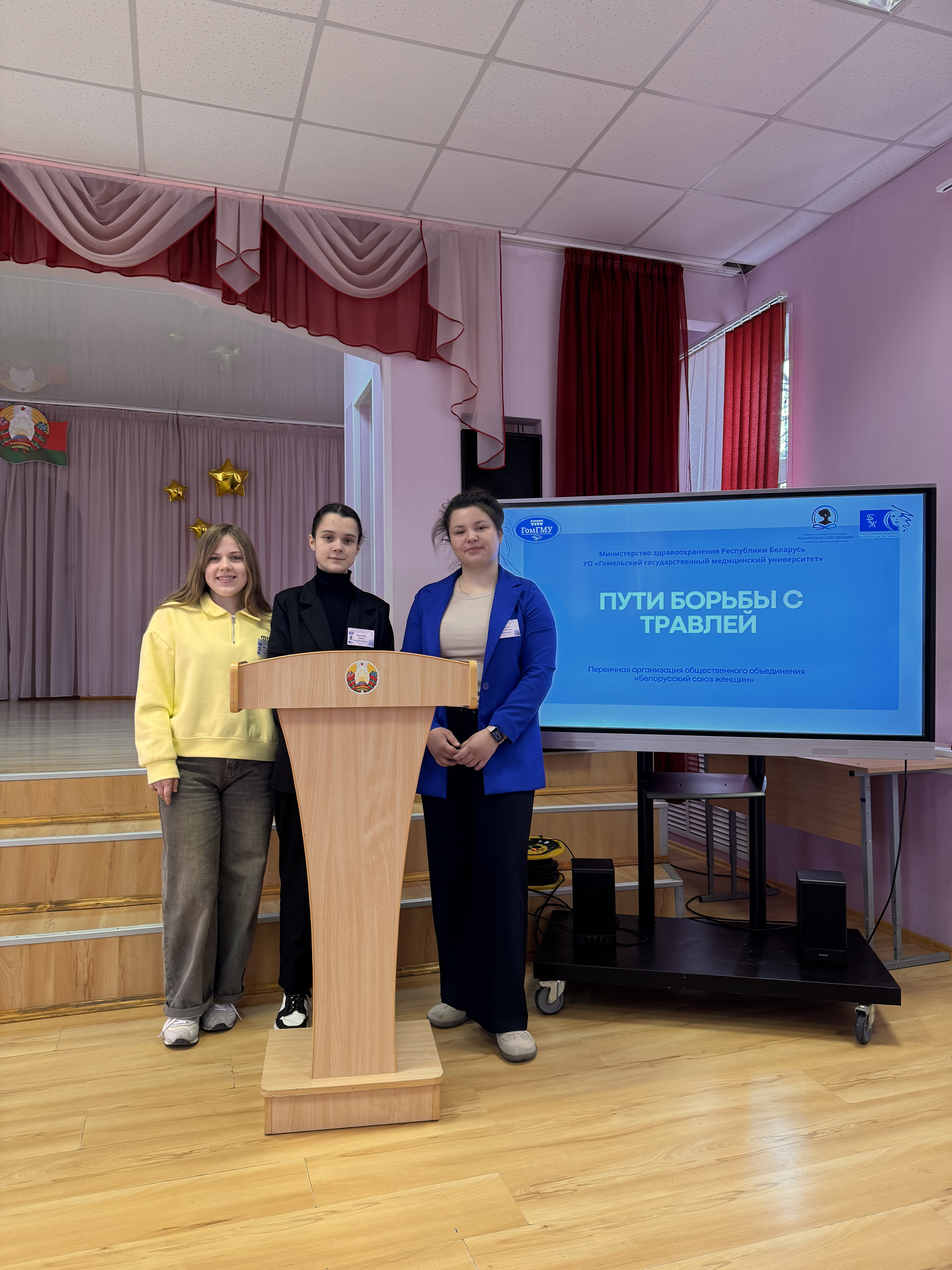 15 апреля 2026 года на базе средней школы № 12 г. Гомеля представители молодежного крыла первичной организации ОО «БСЖ ГомГМУ» - Тетерич Елизавета Игоревна, Казакевич Дарья Александровна, Давлетьярова Дарья Радиковна - студентки лечебного факультета Гомельского государственного медицинского университета провели лекцию по теме «Пути борьбы с травлей».