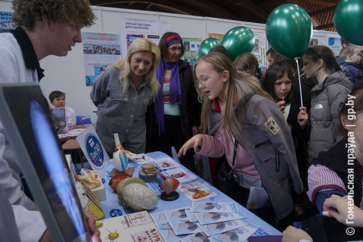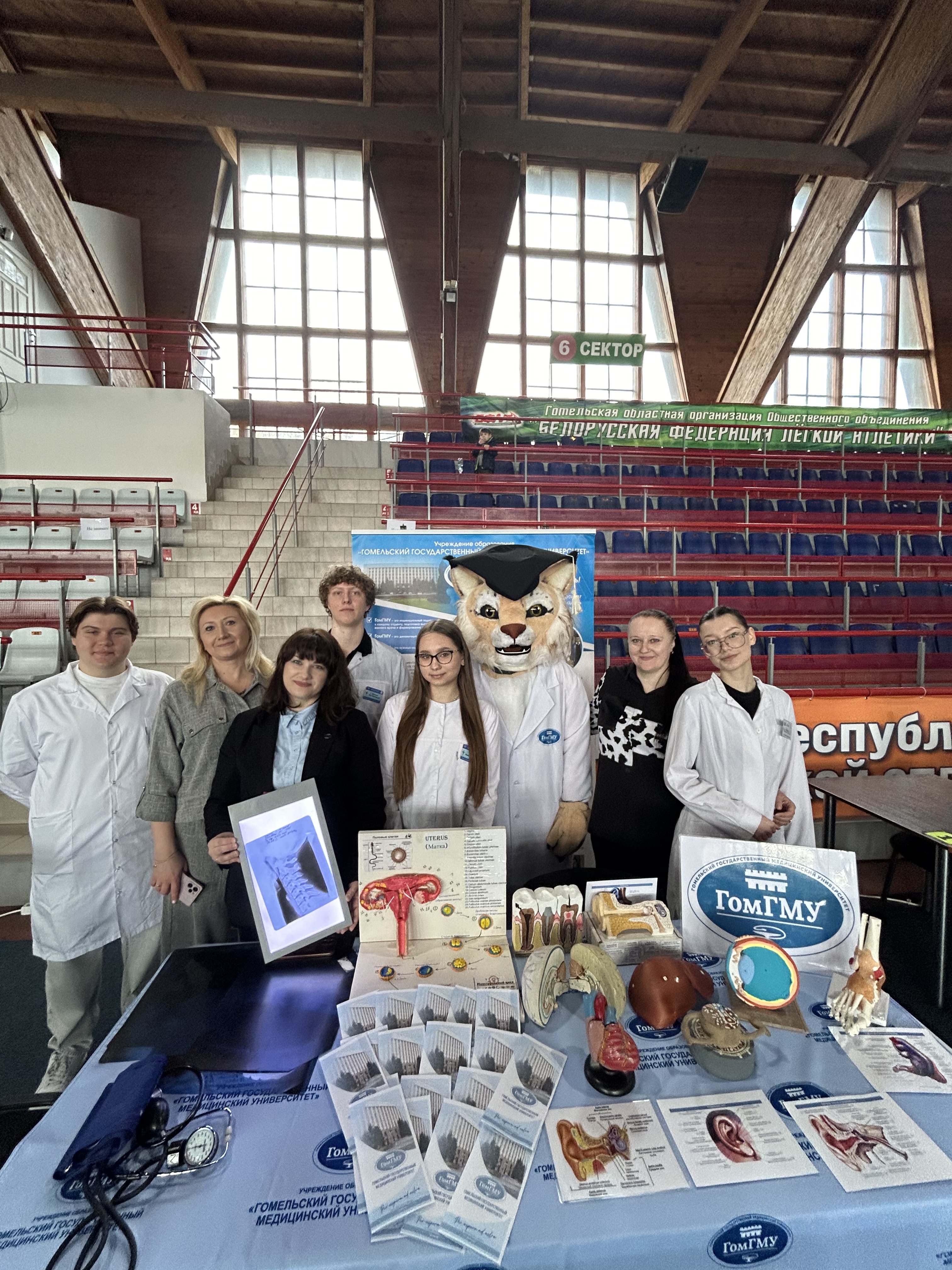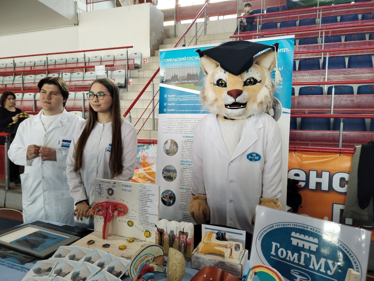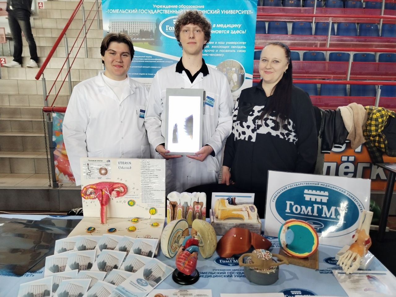 Гомельский государственный медицинский университет представили декан факультета довузовской подготовки Н.П.Тимошенко, преподаватели кафедры нормальной и патологической физиологии Е.Н.Рожкова и Е.С.Сукач, а также наши студенты, которые демонстрировали гостям анатомические модели, работу портативного негатоскопа.