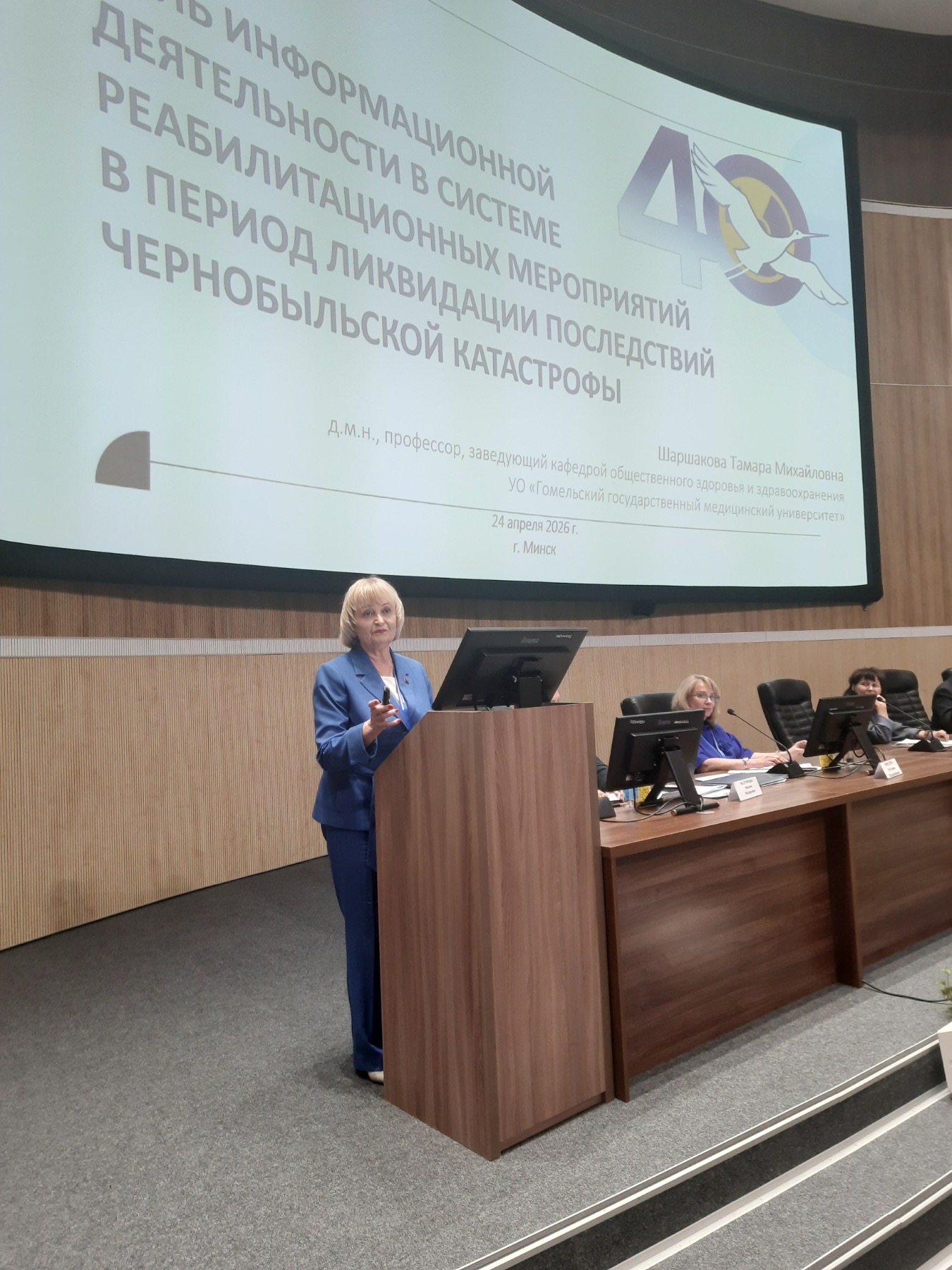 С докладом на тему «Роль информационной деятельности в системе реабилитационных мероприятий в период ликвидации Чернобыльской катастрофы» выступила заведующий кафедрой общественного здоровья и здравоохранения с курсом ФПКиП доктор медицинских наук, профессор Тамара Михайловна Шаршакова.