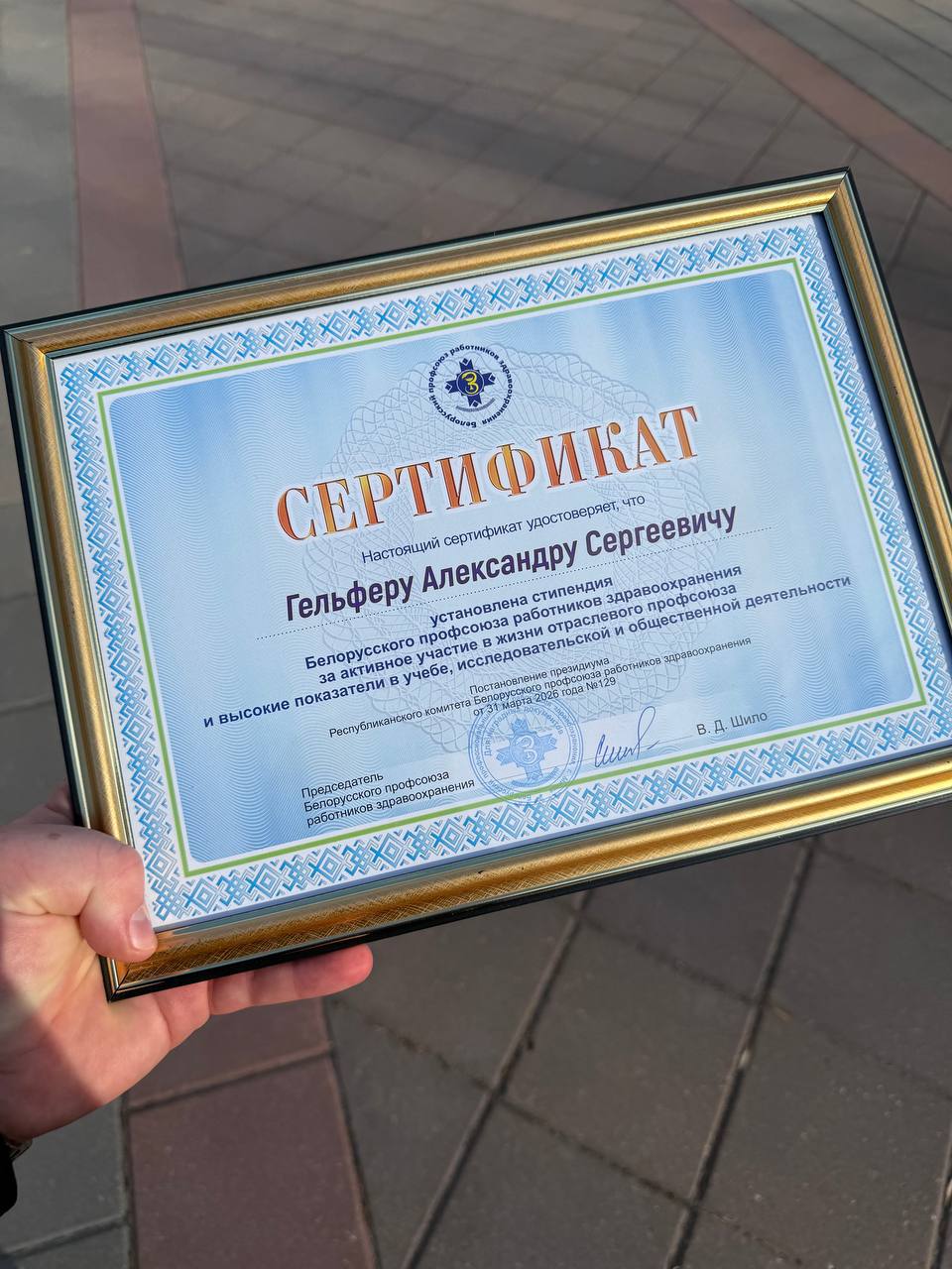 В Белорусском государственном медицинском университете состоялась торжественная церемония вручения сертификатов на получение стипендии отраслевого профсоюза. Почётные награды из рук председателя Белорусского профсоюза работников здравоохранения Вячеслава Шило получили 30 лучших учащихся и студентов медицинских учреждений образования со всей страны.